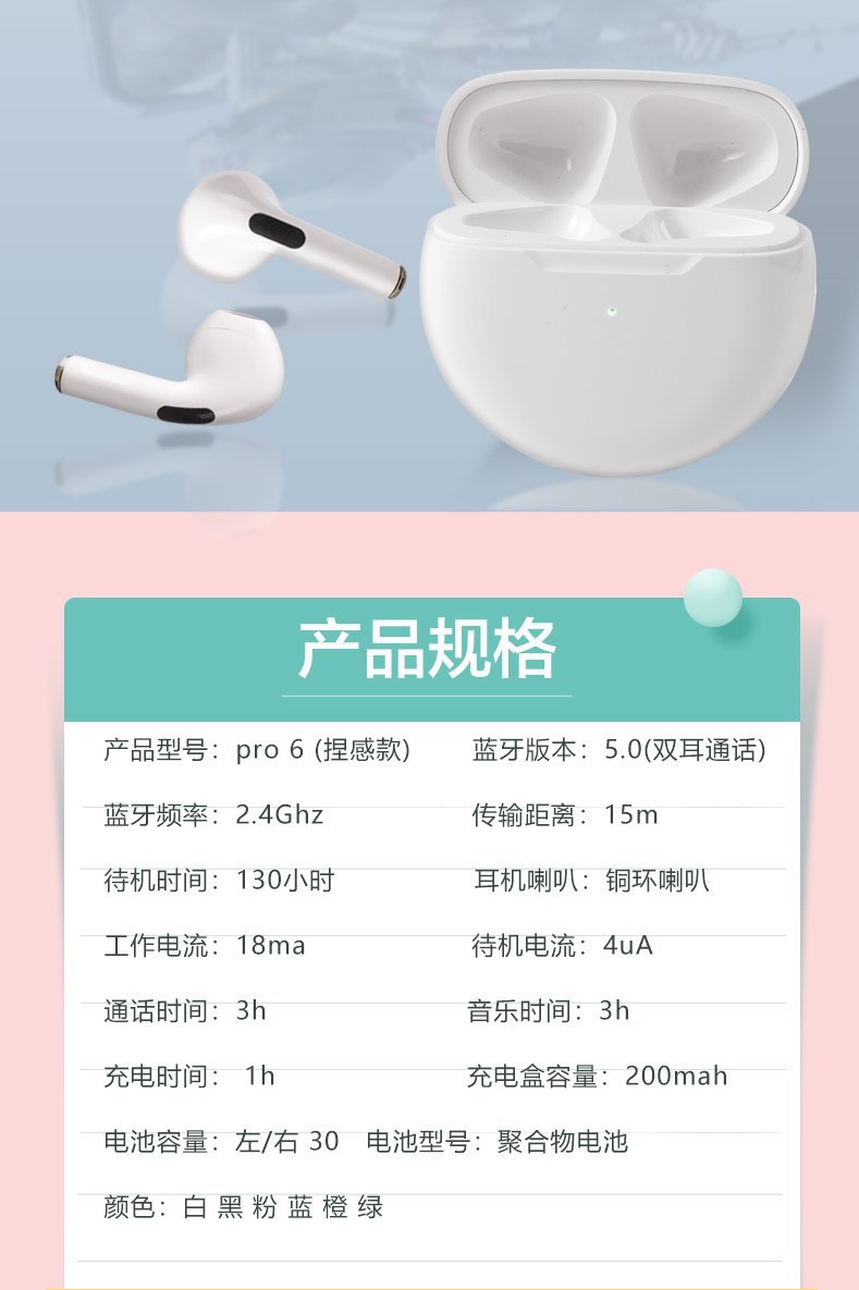 | Color | Pro6 Auricular Bluetooth Blanco [metal desnudo],Auriculares Bluetooth pro6 negro [metal desnudo],Pro6 Auriculares Bluetooth Rosa [metal desnudo],Auriculares Bluetooth pro6 Azul [metal desnudo],Pro6 auriculares Bluetooth púrpura [metal desnudo],Auriculares Bluetooth pro6 Naranja [metal desnudo],Auriculares Bluetooth pro4 Blanco [metal desnudo],Auriculares Bluetooth I12 Blanco [metal desnudo],pro6 empaquetado individualmente sin auriculares |