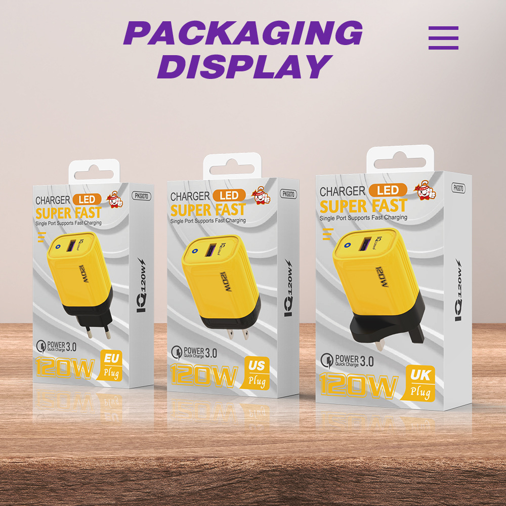 Cargador de protocolo completo USB único para teléfono móvil de 120W, cabezal de carga rápida estándar europeo y americano, puerto USB-A, adaptador para electrodomésticos pequeños