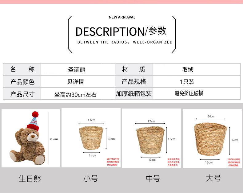 | Colores | Cesta pequeña,Cesta mediana,Cesta grande,Bear sombrero de cumpleaños 1 paquete,Un juego de cestas de flores Fairy Kiss (3 piezas/juego),Bear sombrero de cumpleaños 35cm 1 paquete,Bear sombrero de cumpleaños 30cm 1 paquete |