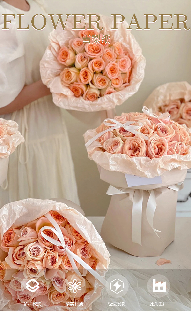 Papel de regalo de flores Papel de pera Papel de algodón Papel perlado Ramo de papel de regalo de flores Papel de embalaje de flores Pastel de hornear Papel de forro al por mayor