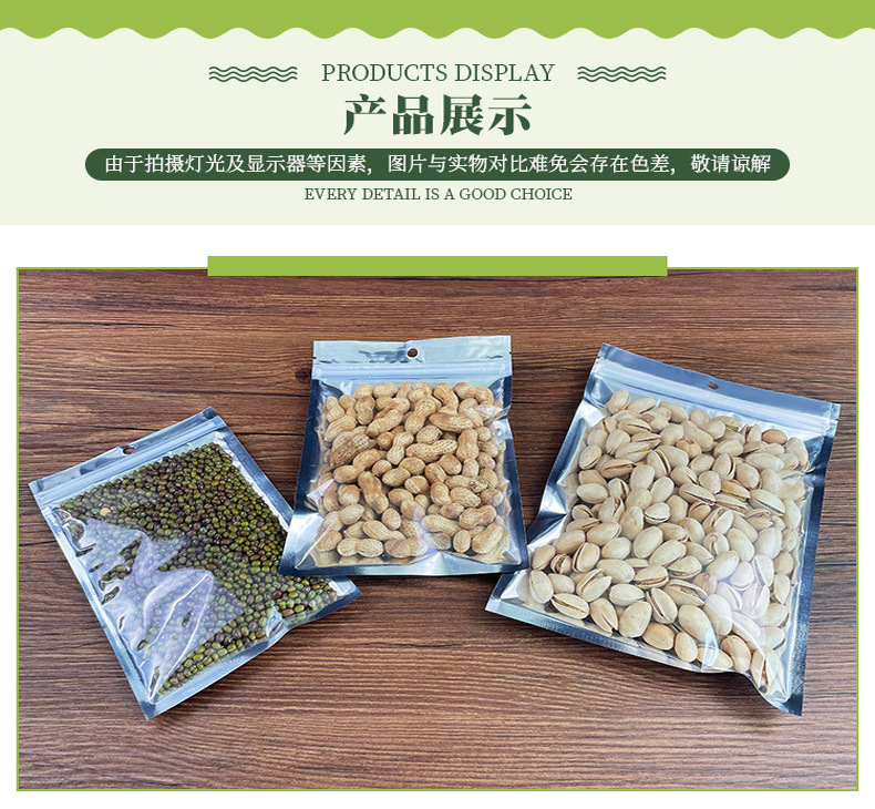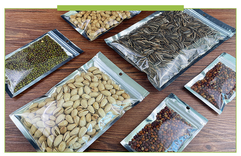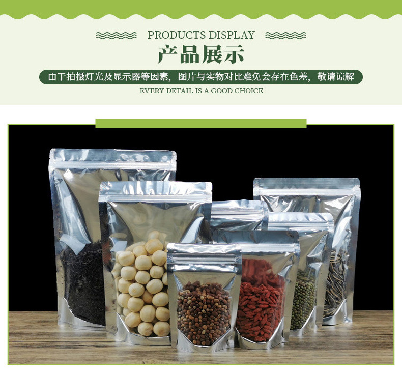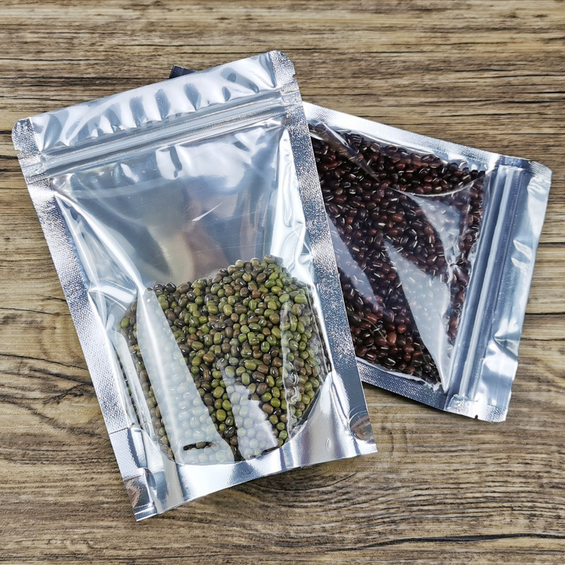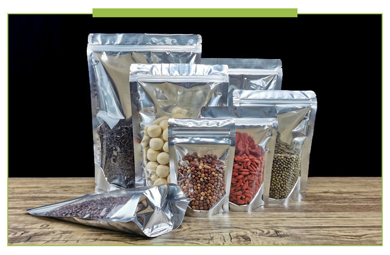 Bolsa ziplock chapada en aluminio, bolsa de papel de aluminio, ventana abierta, bolsa autoportante, línea de datos translúcida, bolsa sellada de grado alimenticio, bolsa ziplock plateada