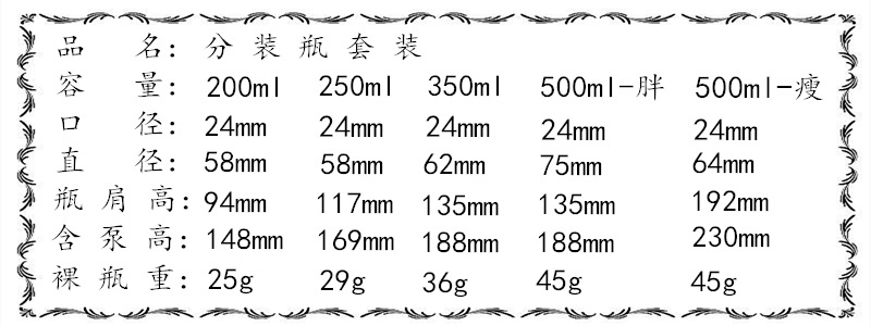 Modelo de especificaciónBomba de aceite blanco DP200ml; blanco (botella desnuda predeterminada sin pegatina),Bomba de aceite negro DP200ml; blanco (botella desnuda predeterminada sin pegatina),Bomba de aceite de oro DP200ml; blanco (botella desnuda predeterminada sin pegatina),Bomba de aceite de plata DP200ml; blanco (botella desnuda predeterminada sin pegatina),DP200ml ABS chapado en oro; blanco (botella desnuda predeterminada sin pegatina),DP200ml ABS plateado; blanco (botella desnuda predeterminada sin pegatina),DP200ml ABS oro rosa; blanco (botella desnuda predeterminada sin pegatina),Bomba de aceite blanco DP250 ml; blanco (botella desnuda predeterminada sin pegatina),Bomba de aceite negro DP250 ml; blanco (botella desnuda predeterminada sin pegatina),Bomba de aceite de oro DP250 ml; blanco (botella desnuda predeterminada sin pegatina),Bomba de aceite de plata DP250 ml; blanco (botella desnuda predeterminada sin pegatina),DP250 ml ABS chapado en oro; blanco (botella desnuda predeterminada sin pegatina),DP250 ml ABS plateado; blanco (botella desnuda predeterminada sin pegatina),DP250ml ABS oro rosa; blanco (botella desnuda predeterminada sin pegatina),Bomba de aceite blanco DP350ml; blanco (botella desnuda predeterminada sin pegatina),Bomba de aceite negro DP350ml; blanco (botella desnuda predeterminada sin pegatina),Bomba de aceite de oro DP350ml; blanco (botella desnuda predeterminada sin pegatina),Bomba de aceite de plata DP350ml; blanco (botella desnuda predeterminada sin pegatina),DP350ml ABS chapado en oro; blanco (botella desnuda predeterminada sin pegatina),DP350ml ABS plateado; blanco (botella desnuda predeterminada sin pegatina),DP350ml ABS oro rosa; blanco (botella desnuda predeterminada sin pegatina),Bomba de aceite blanco DP500ml; blanco (botella desnuda predeterminada sin pegado),Bomba de aceite blanco MG500ml; blanco (botella desnuda predeterminada sin pegatina),Bomba de aceite negro DP500ml; blanco (botella desnuda predeterminada sin pegatina),Bomba de aceite negro MG500ml; blanco (botella desnuda predeterminada sin pegatina),Bomba de aceite de oro DP500ml; blanco (botella desnuda predeterminada sin pegatina),Bomba de aceite de oro MG500ml; blanco (botella desnuda predeterminada sin pegatina),Bomba de aceite de plata DP500ml; blanco (botella desnuda predeterminada sin pegatina),Bomba de aceite de plata MG500ml; blanco (botella desnuda predeterminada sin pegatina),DP500ml ABS chapado en oro; blanco (botella desnuda predeterminada sin pegatina),MG500ml ABS chapado en oro; blanco (botella desnuda predeterminada sin pegatina),DP500ml ABS plateado; blanco (botella desnuda predeterminada sin pegatina),MG500ml ABS plateado; blanco (por defecto botella desnuda sin pegatina),DP500ml ABS oro rosa; blanco (botella desnuda predeterminada sin pegatina),MG500ml ABS oro rosa; blanco (botella desnuda predeterminada sin pegatina)