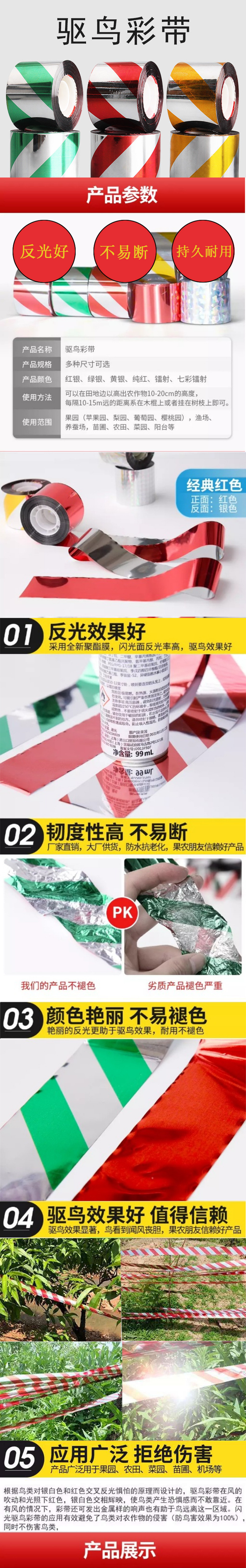 Aislamiento de campo seco Orchard pájaro repelente cinta reflectante pájaro repelente advertencia láser cinta reflectante soporte