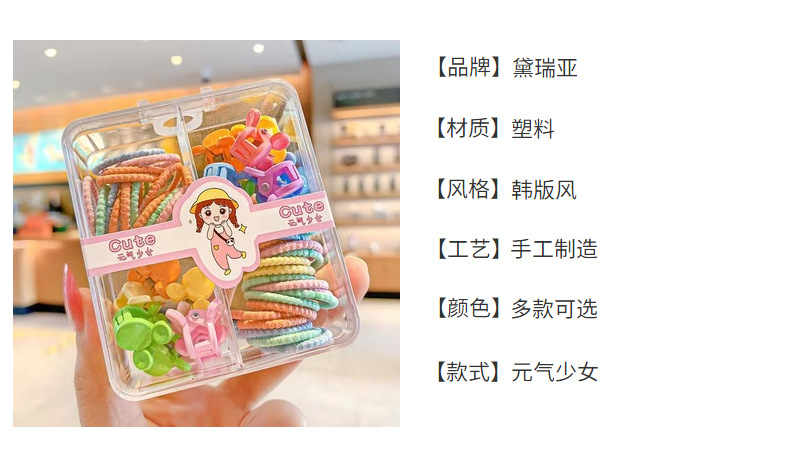 | Colores | 7 #0.2 color caramelo de goma pequeña (90 cajas),11 #0.2 pequeña banda de goma negra (90 en caja),13 # Macarons de hilo grueso (90 en caja),1 # color primavera de hilo grueso (90 en caja),2 # color caramelo de frijol (90 en caja),6 # color de primavera de frijol (90 en caja),9 # frijoles negros (90 cajas),3 # color de primavera de hilo fino (90 en caja),5 #0.2 bandas de goma 40 clips de ciruela 10 piezas (en caja),10 # bandas de goma de hilo fino 40 clips de clip de conejo 10 piezas (en caja),14 # Banda de goma de frijol 40 clips de flor de ciruelo 10 clips (en caja),8 # banda de goma de rosca gruesa 40 clips de corona 10 clips (en caja),4 # Frutas impresas con bandas de goma pequeñas (60 cajas),12 # lazo impreso con banda de goma pequeña (60 cajas),15 # Cherry con cinta de goma pequeña (60 cajas),16 # Banda de goma pequeña negra (60 cajas),17 #0.2 Banda de goma pequeña color marrón con leche (90 en caja),18 # Encaje marrón con leche + hilo grueso (60 en caja) |