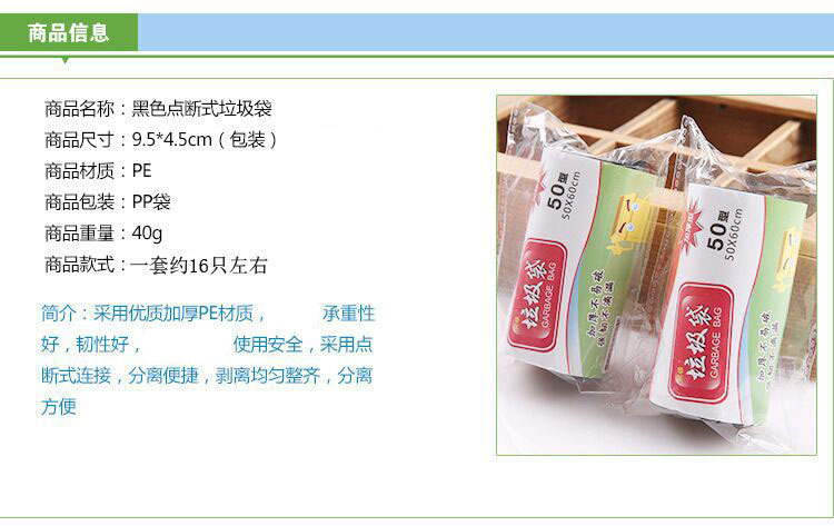 | Colores | Bolsa de basura barata negro,Cordón 1 rollo negro,Boca plana 30 piezas negro,Boca plana 50 piezas negro,Estilo chaleco, aprecio 100 piezas negras,Cordón 2 rollos negro,Cordón 2 rollos rosa roja,Cordón 2 rollos azul,Cordón 5 rollos negro,Cordón 5 rollos azul,Estilo chaleco 5 rollos negro,Color de 5 rollos tipo chaleco,100 cordones de meteorito negro,El modelo de lunares se dibula en 100 piezas negras |