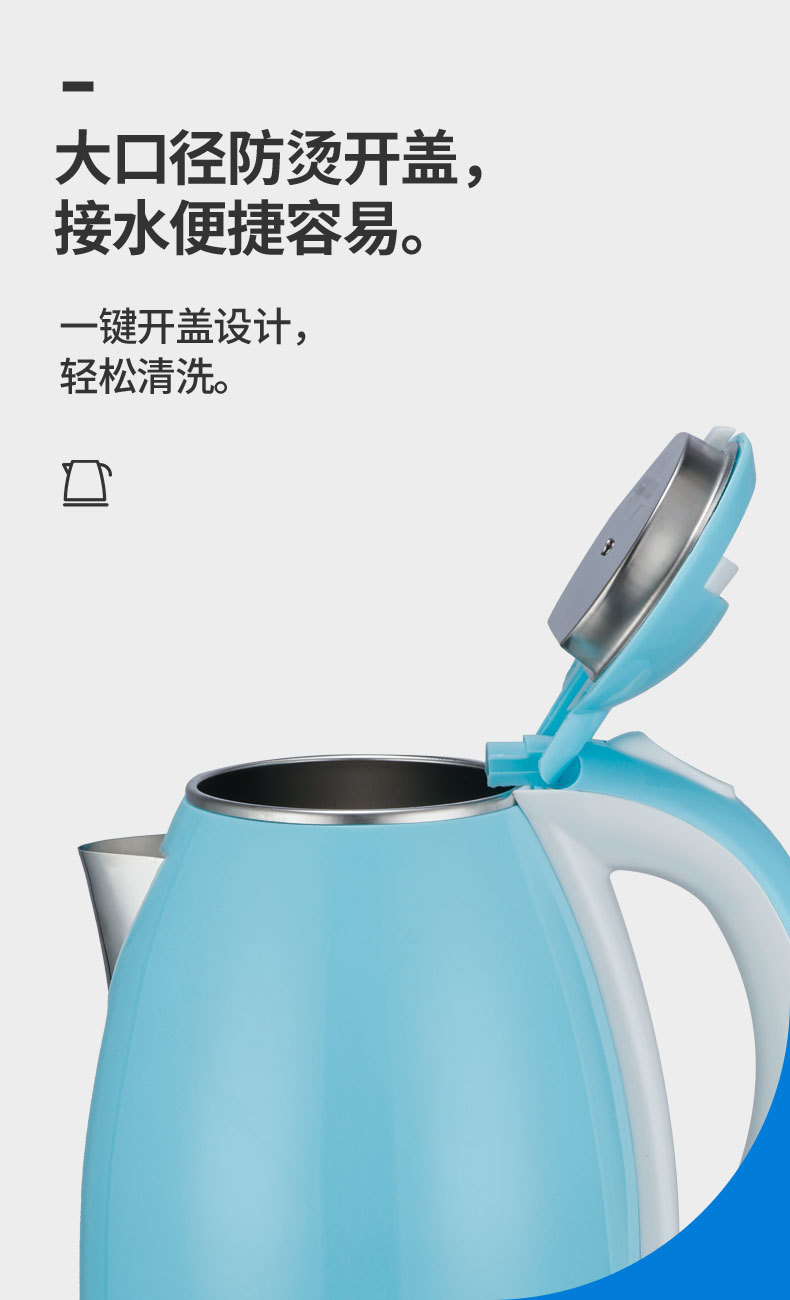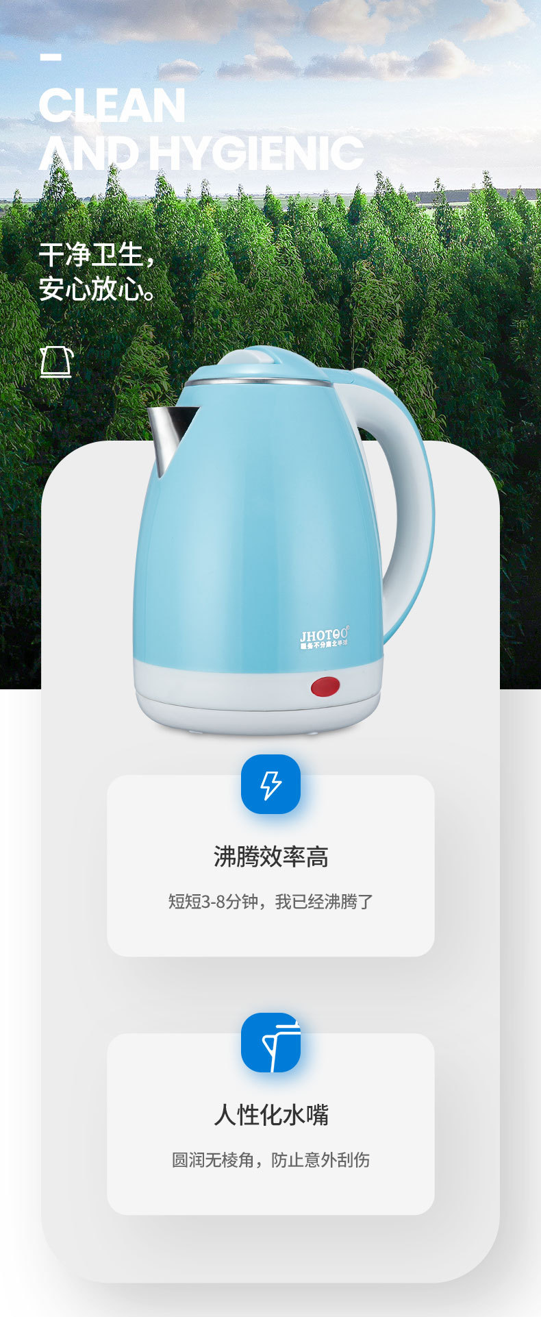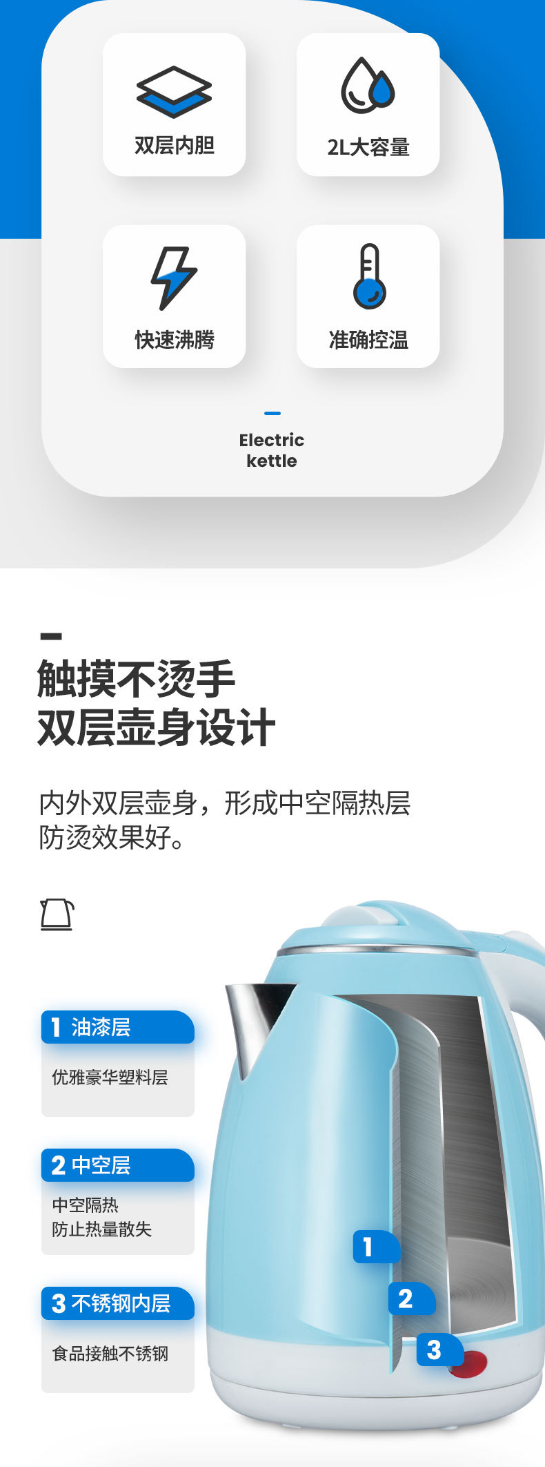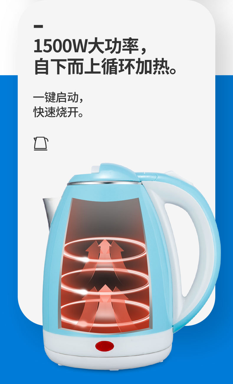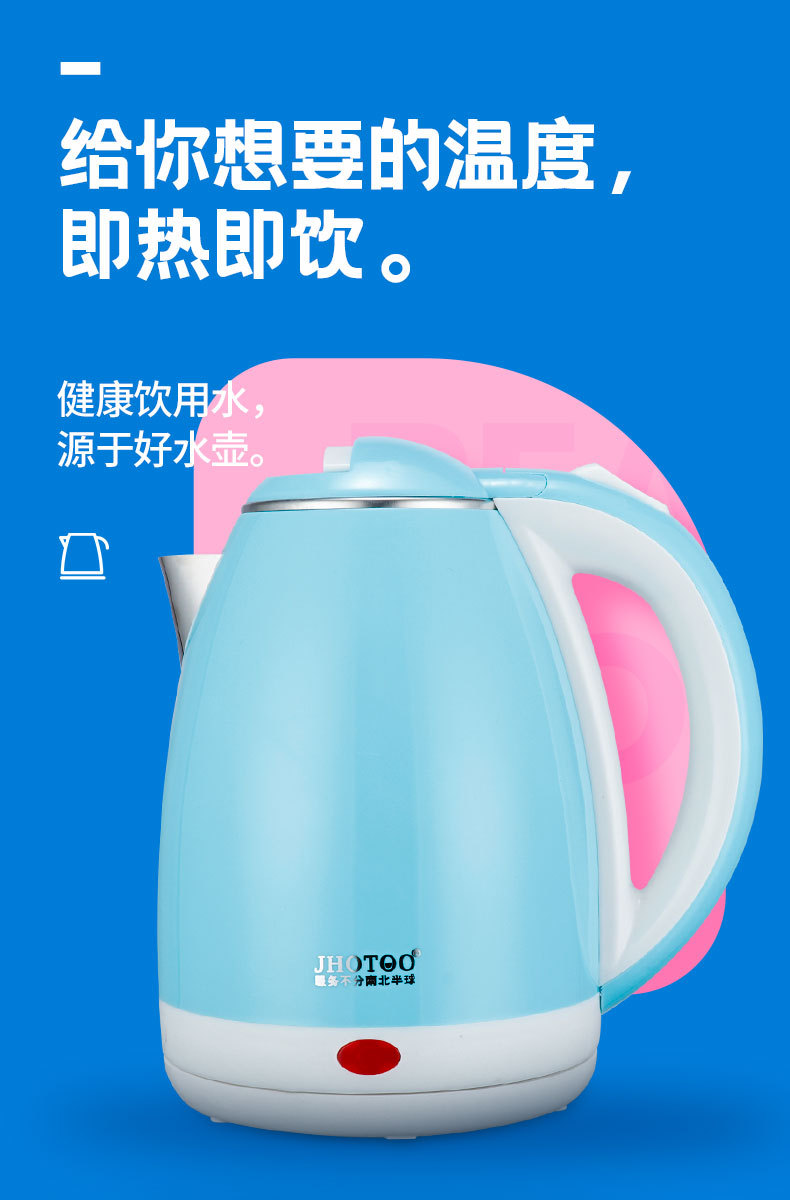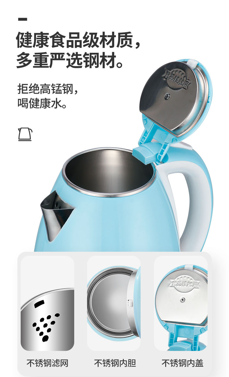 Hervidor eléctrico cuidadosamente seleccionado para uso doméstico, apagado automático, acero inoxidable de grado alimenticio, hervidor de doble capa anti-quemaduras, hervidor de ebullición rápida para regalo promocional.