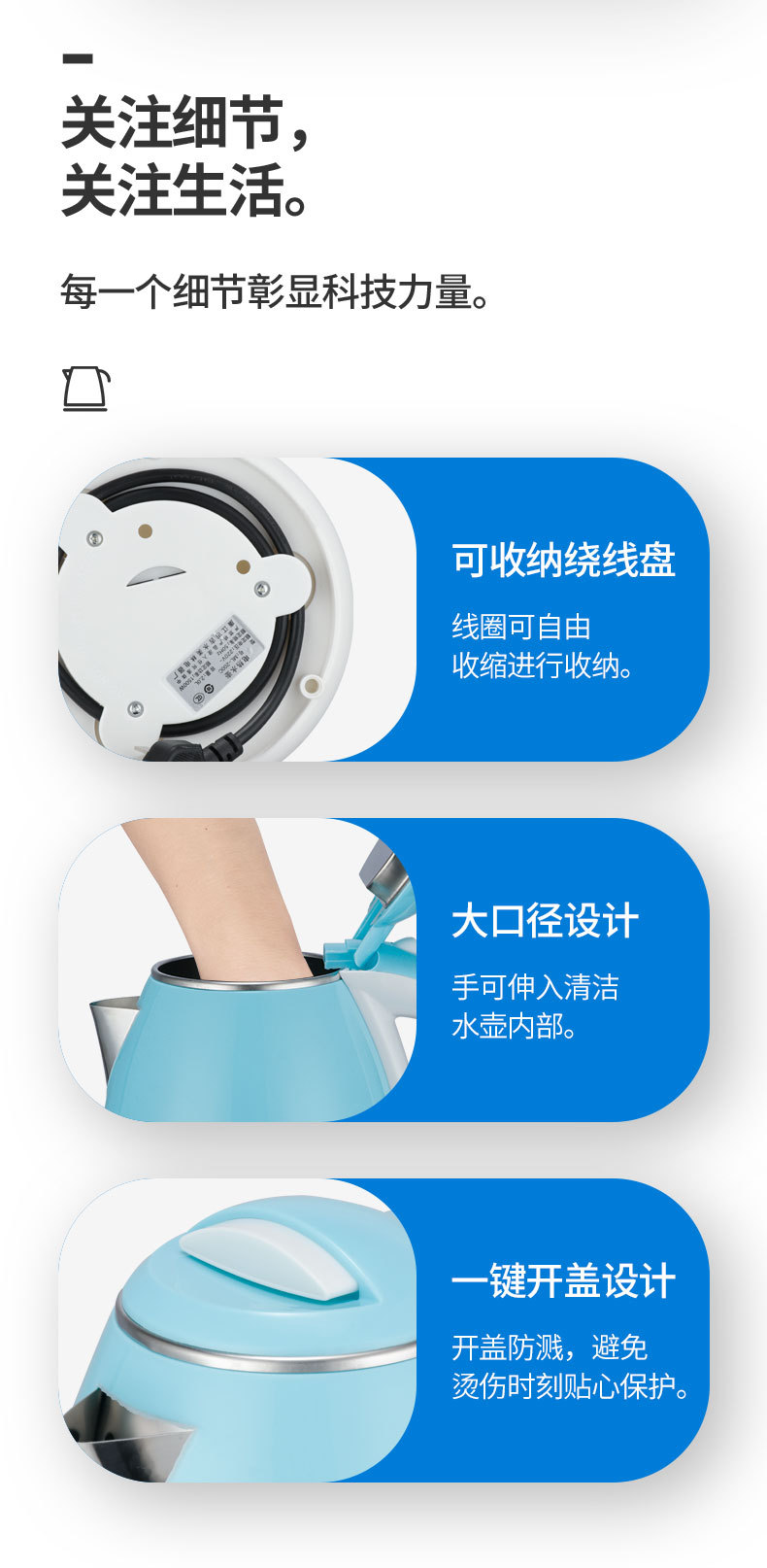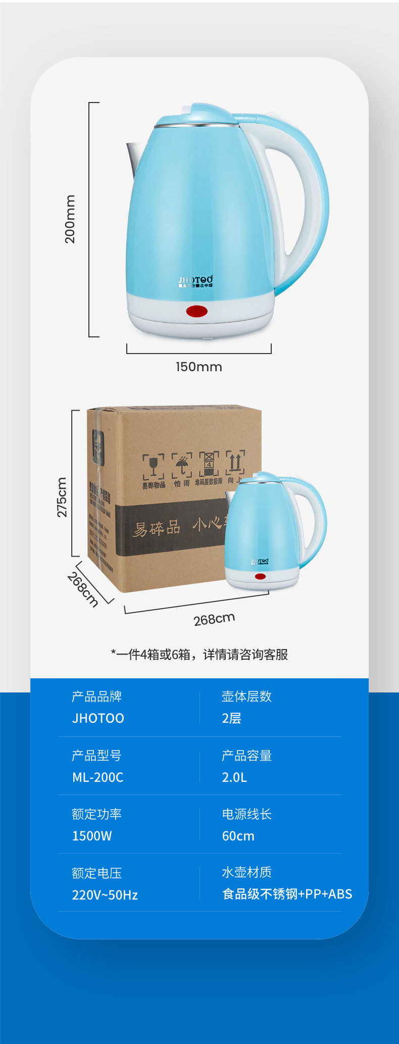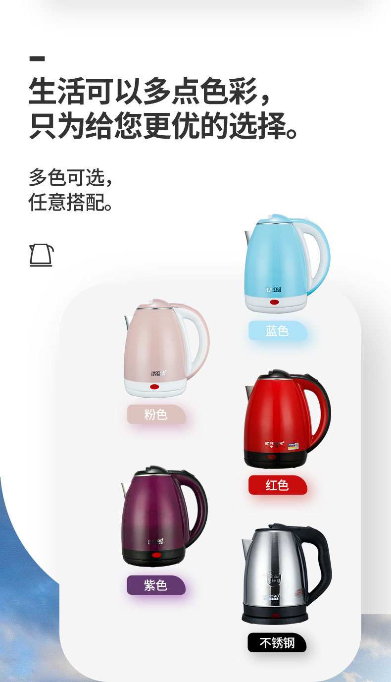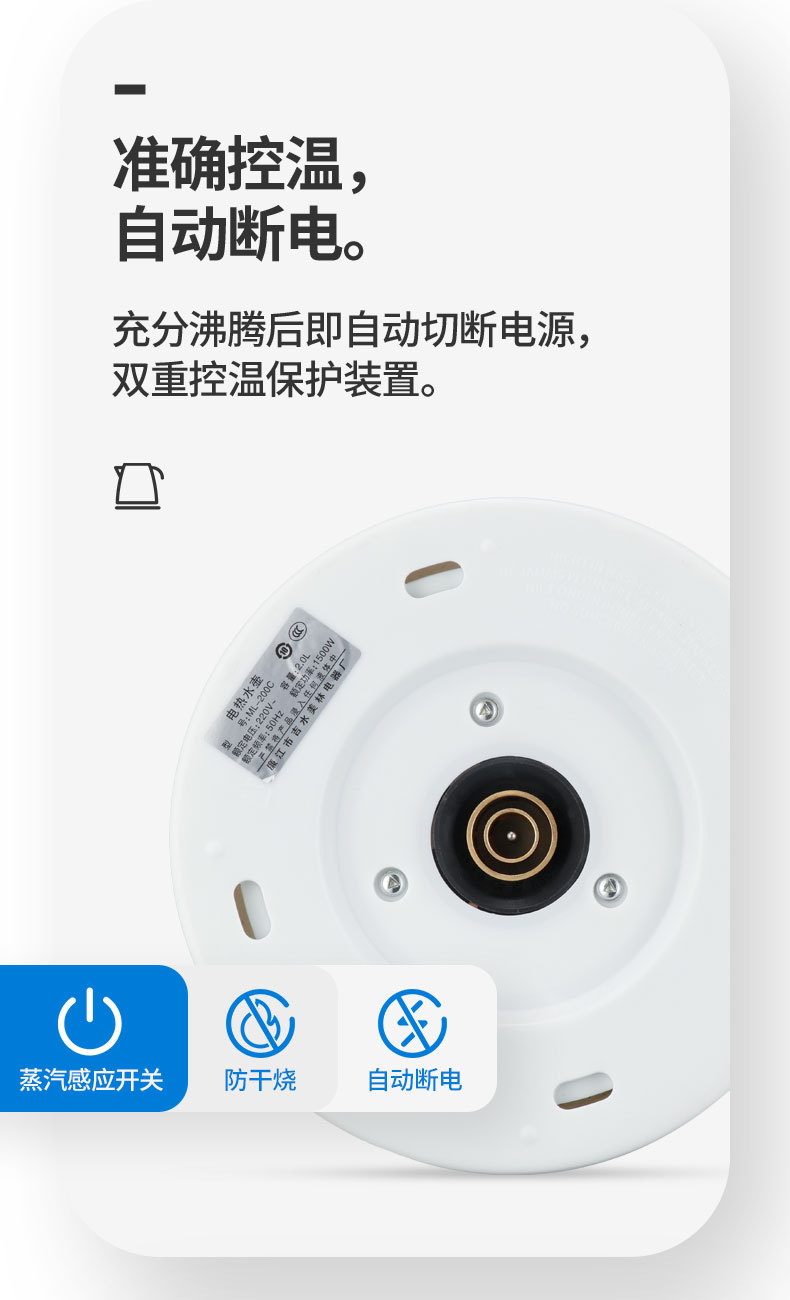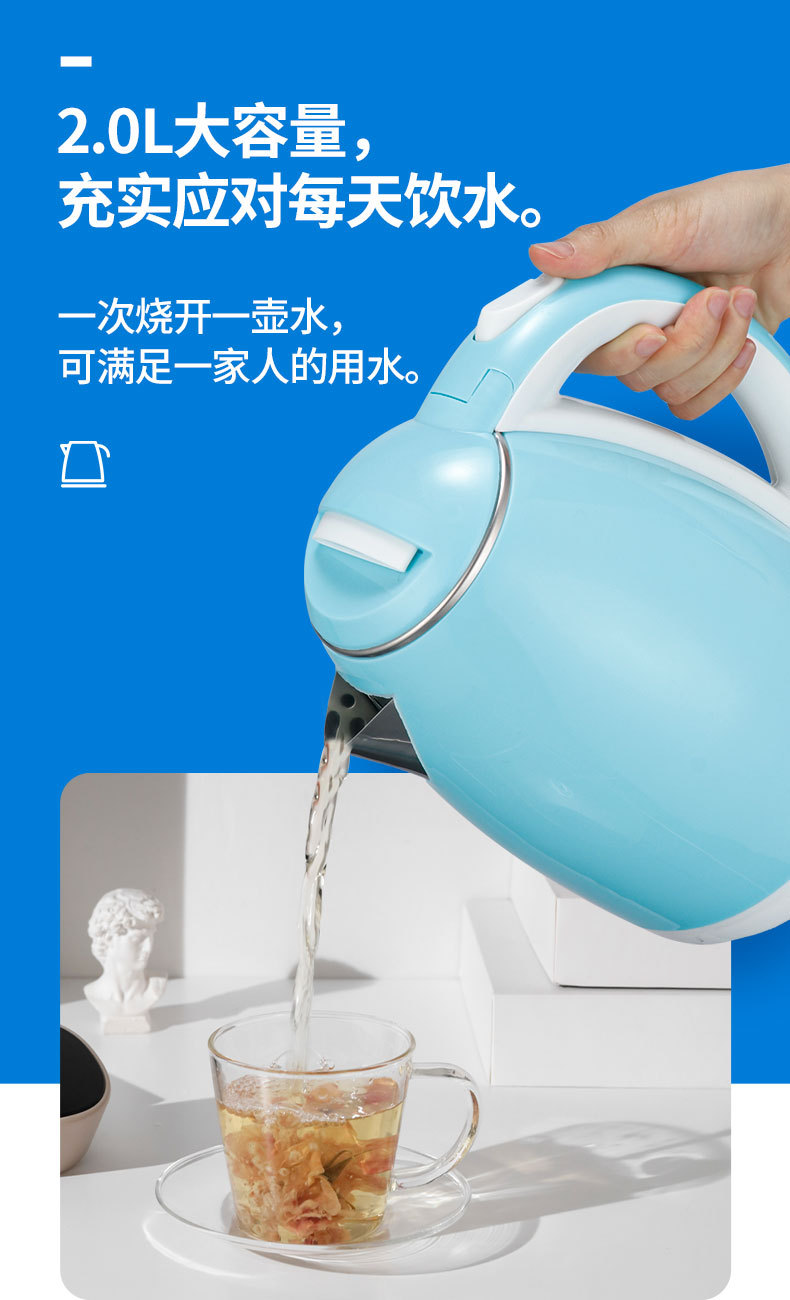 Hervidor eléctrico cuidadosamente seleccionado para uso doméstico, apagado automático, acero inoxidable de grado alimenticio, hervidor de doble capa anti-quemaduras, hervidor de ebullición rápida para regalo promocional.