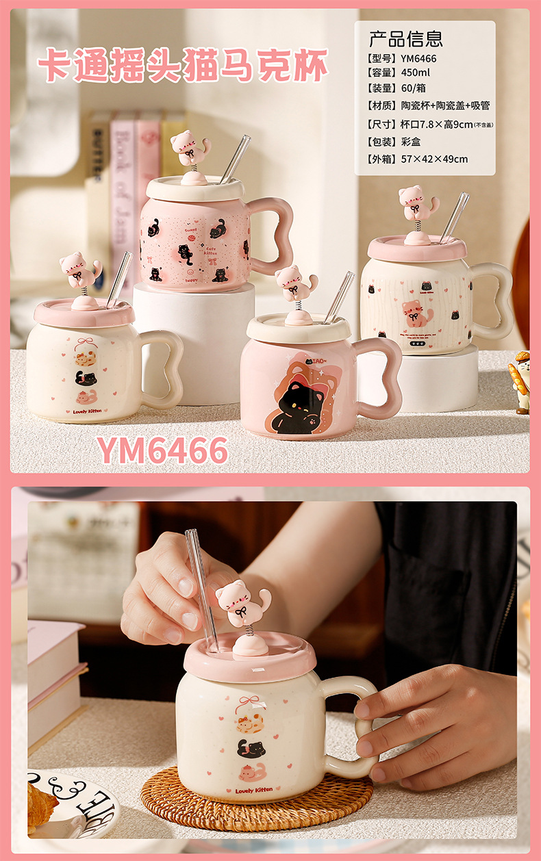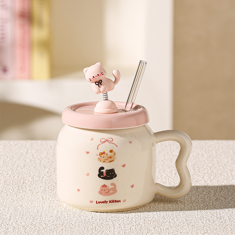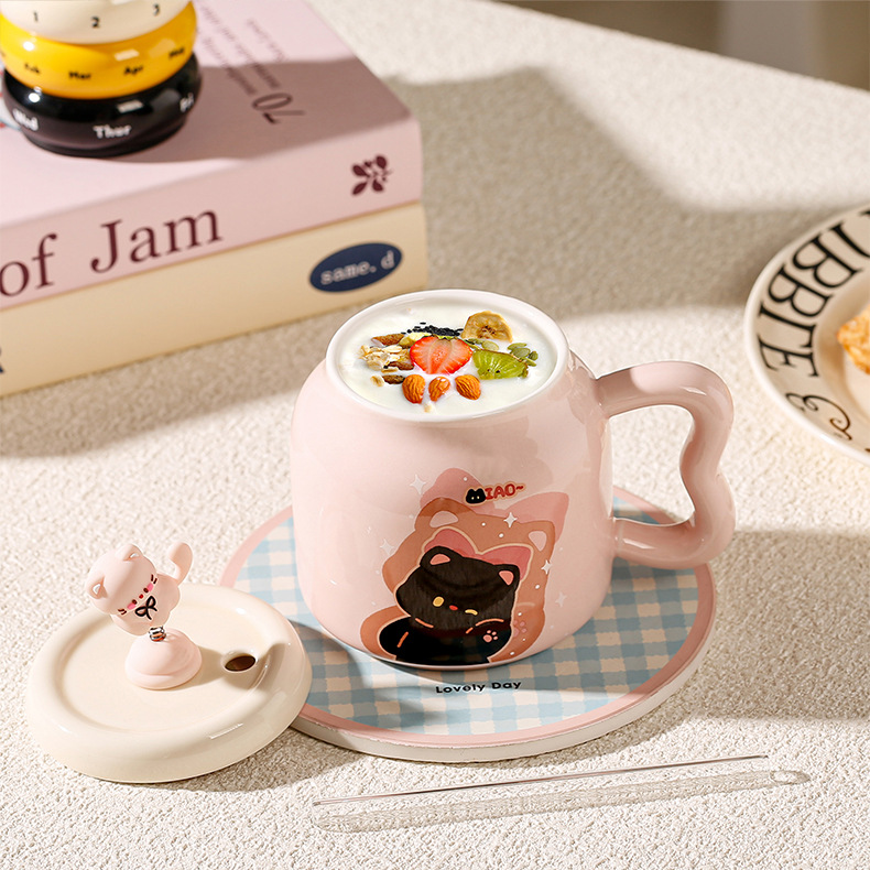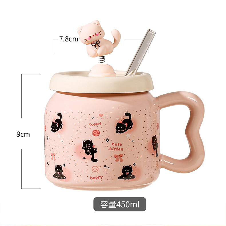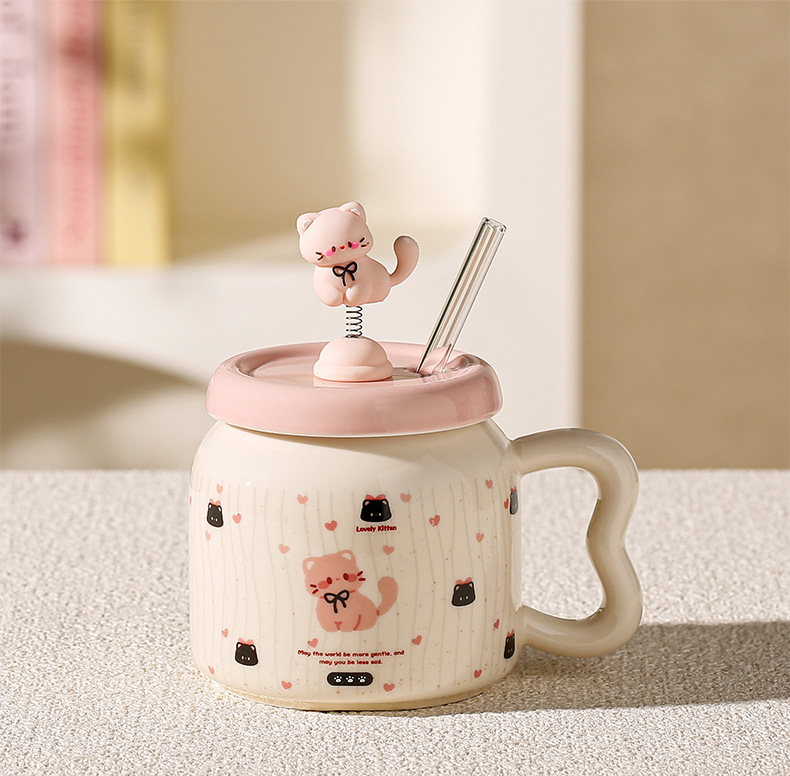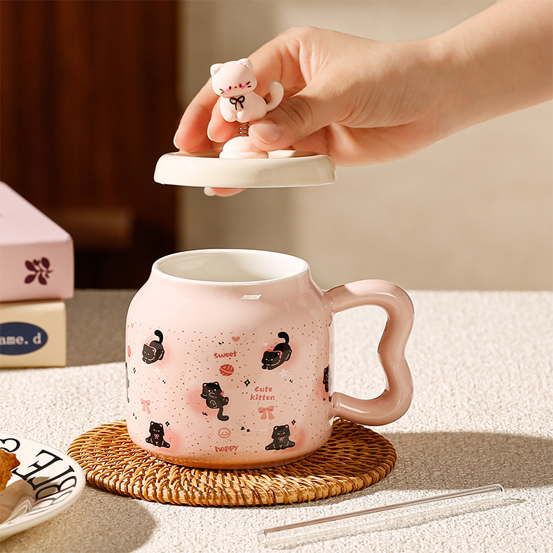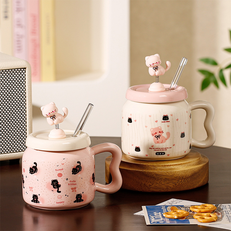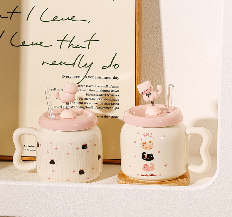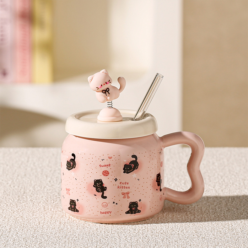 Taza de Cerámica con Pajita, Estilo Gato Negro, Linda y Suave, con Tapa, Para Oficina, Hogar y Parejas