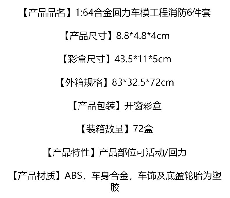 1:64 aleación tire hacia atrás modelo de coche ingeniería fuego simulación coche modelo juguete coche decoración de los niños traje al por mayor