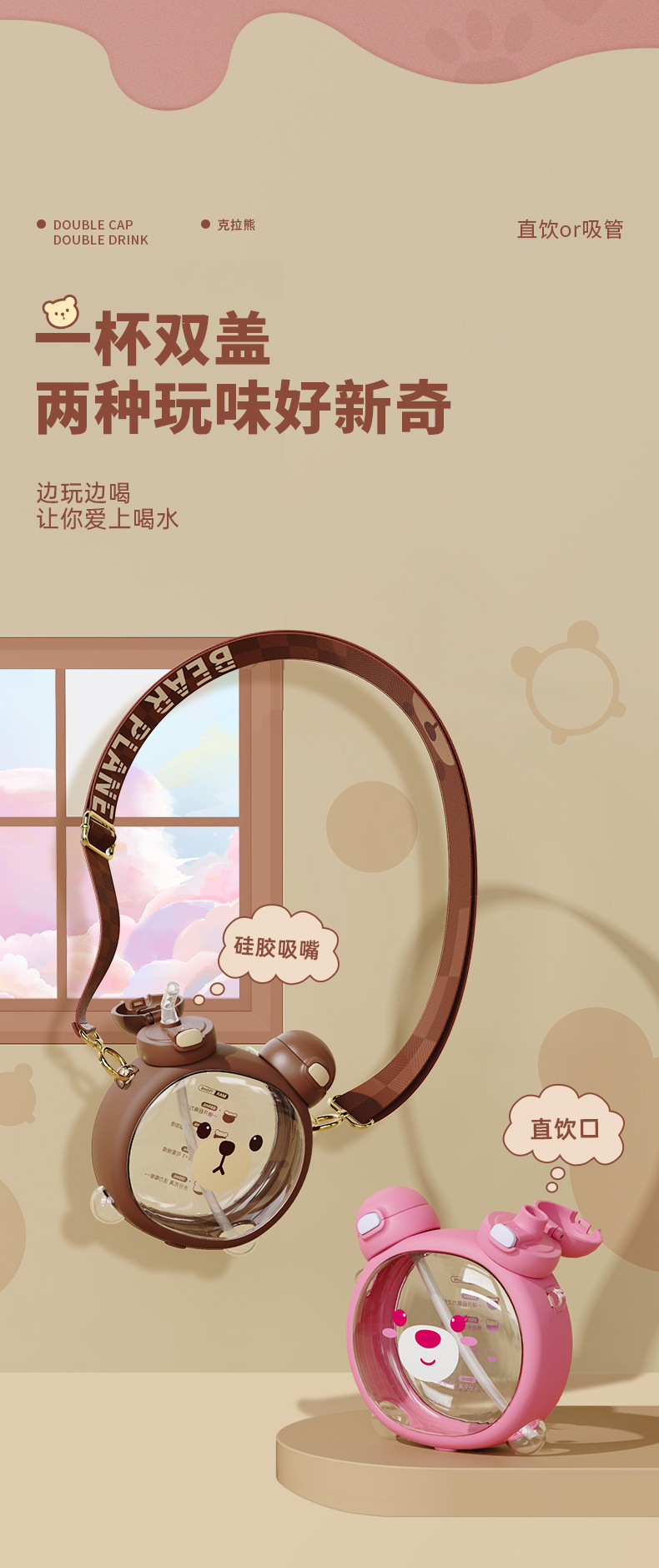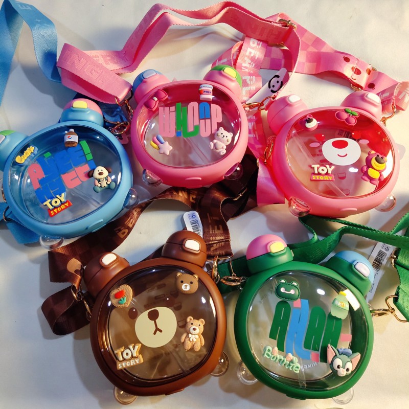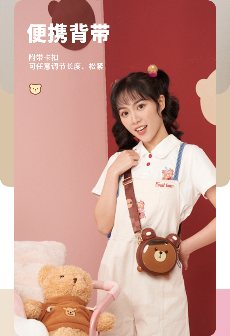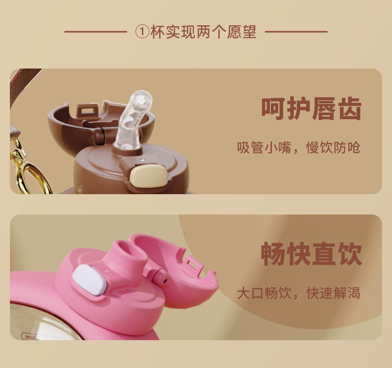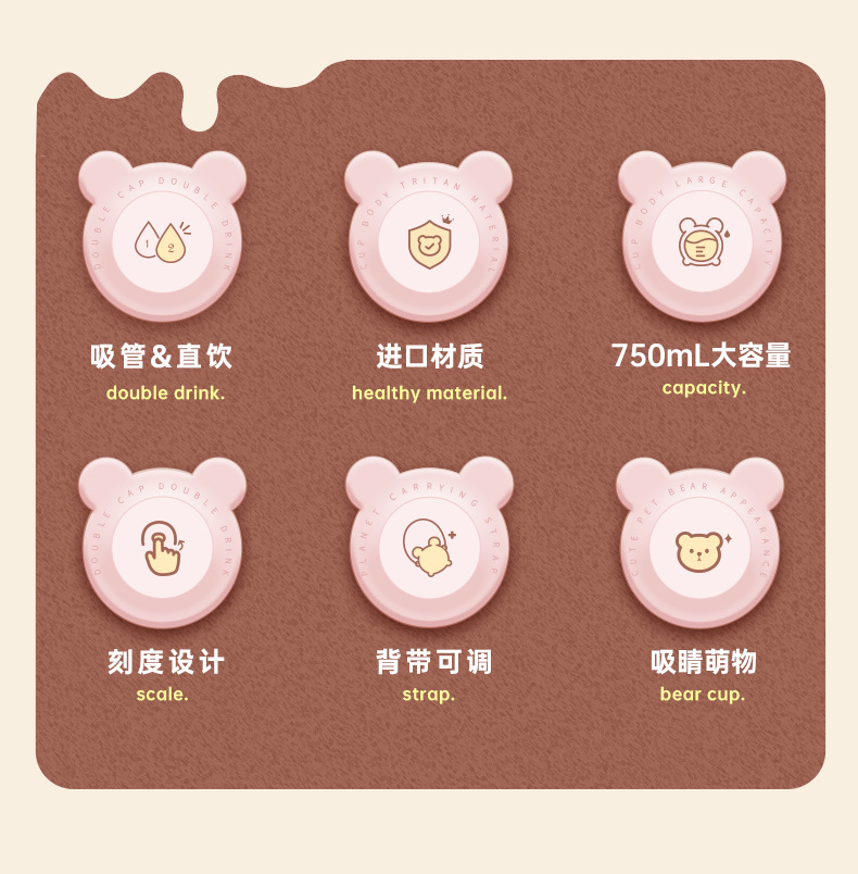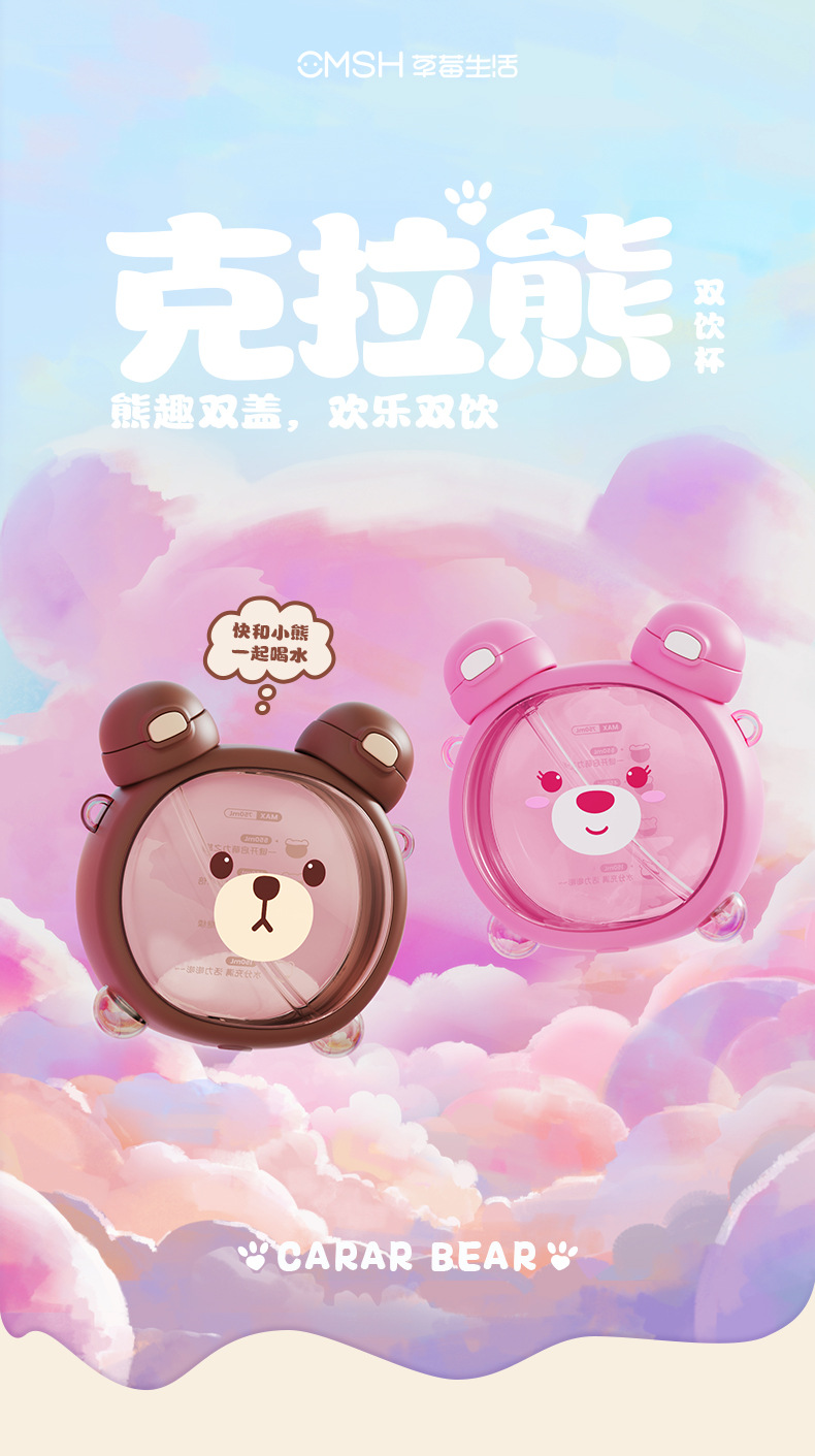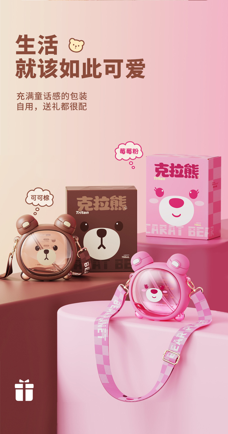 Taza de agua para niños diseño vida de fresa y oso, doble pajita, plástico resistente al calor 750ML, súper lindo hervidor para estudiantes.
