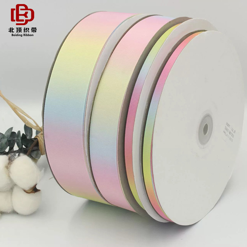 Venta al por mayor colorido Arco Iris gradiente poliéster transferencia caliente impresión cinta DIY cinta en stock caja de regalo tocado floral vendaje