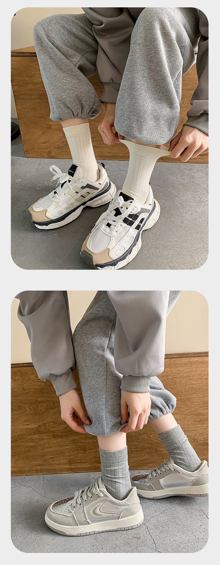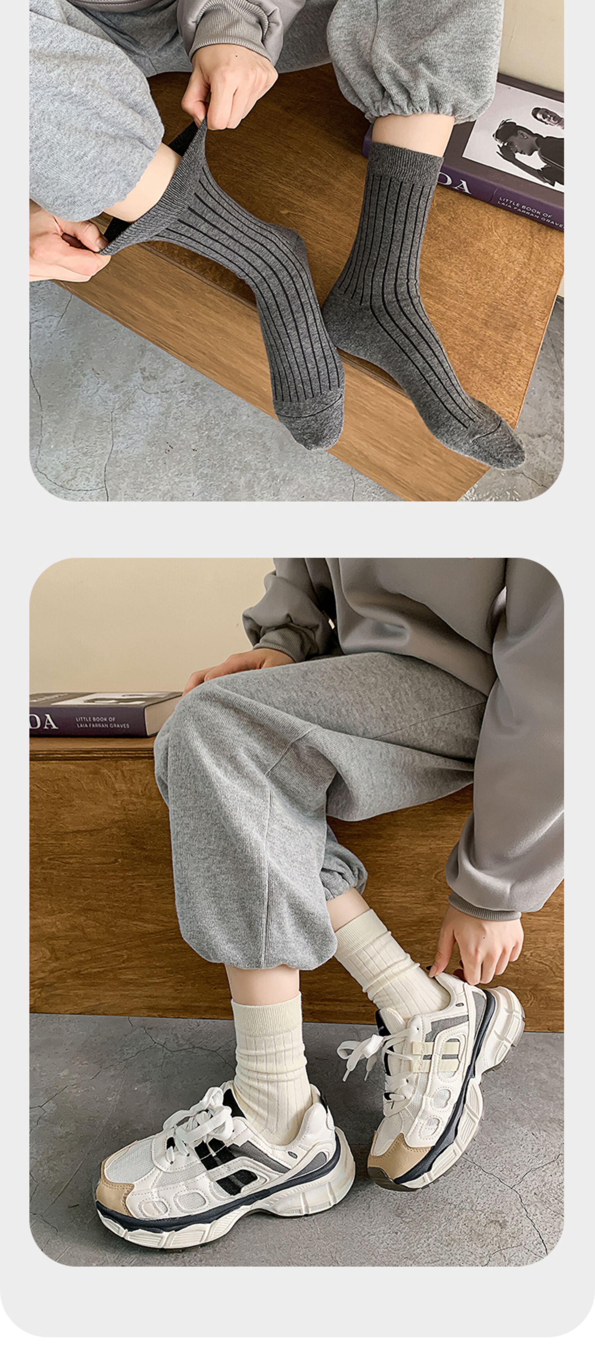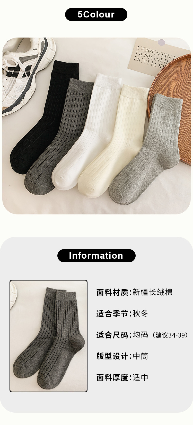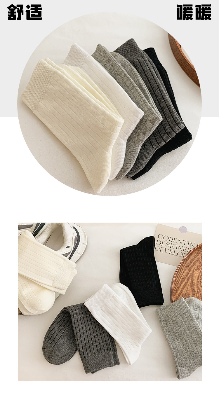 Primavera y otoño negro, blanco y gris doble aguja de pozo ancho Todo partido calcetines de mujer de media pantorrilla estilo universitario de mujer Four Seasons calcetines de pila portátiles