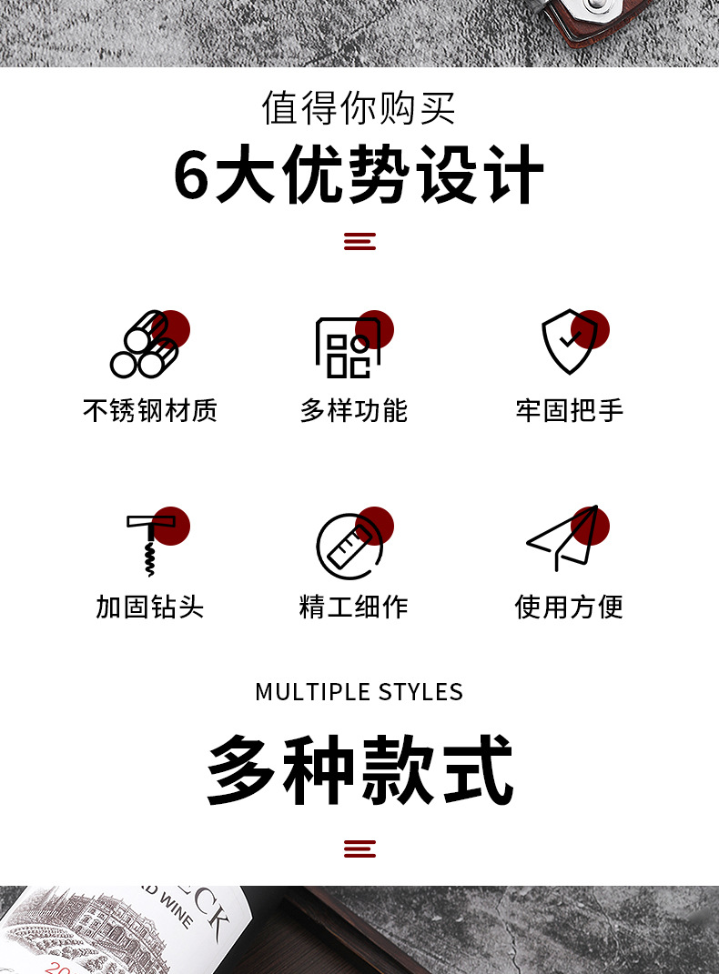 | Colores | Abrebotellas rojo [Tops de madera de ratán rojo],Abrebotellas amarillo [Tops de haya],Sacacorchos plateados [todos los tapones de acero],Abridor de botellas negro [toma de plástico],Abridor de botellas rojo [toma de plástico],Abrebotellas rojo [caoba],Abrebotellas amarillo [palo de rosa de acero inoxidable],Cuchillo de mar de mango estrecho,Sacacorchos negro [boca de flecha de plástico],Sacacorchos plateados [cuchillo de vino de caballo de mar totalmente de acero],Red [madera de color de acero de doble cabezal] rejilla grande,Nueva palabra caoba,Tops de madera de amor dorado,Caja de regalo con toque de madera de ratán rojo |