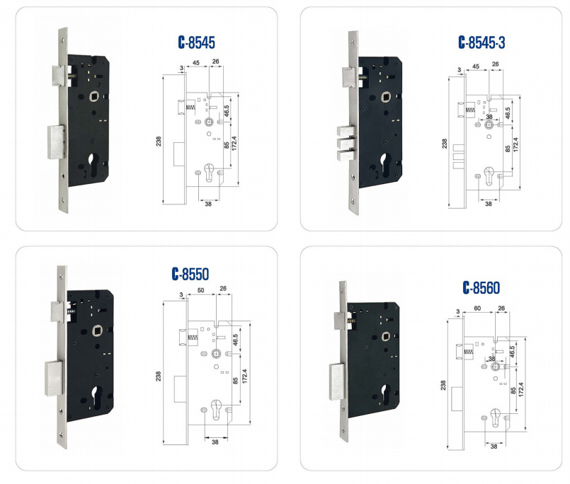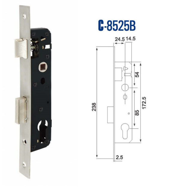 Suministro de fábrica cerradura de puerta antirrobo cuerpo de cerradura de acero inoxidable estándar europeo internacional C-8525 cerradura de puerta mecánica accesorios al por mayor