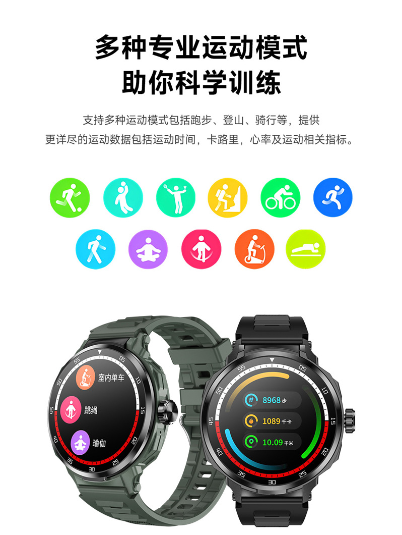 运动数据(计步、距离、卡路里)、室内运动(俯卧撑、室内跑步、平板撑、室内单车、跳绳、瑜伽、战绳、仰卧起坐、椭圆机)、户外运动(户外步行、户外跑步、户外骑行、登山、羽毛球、篮球、足球) |