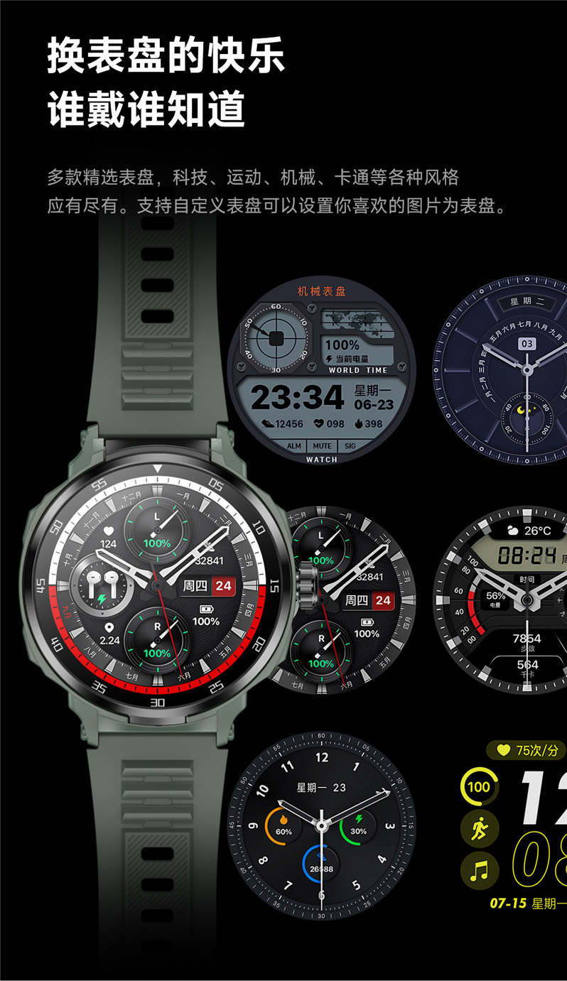 NFC、APP个性自定义表盘、手表6种UI界面切换、通讯录、蓝牙拨号通话 |