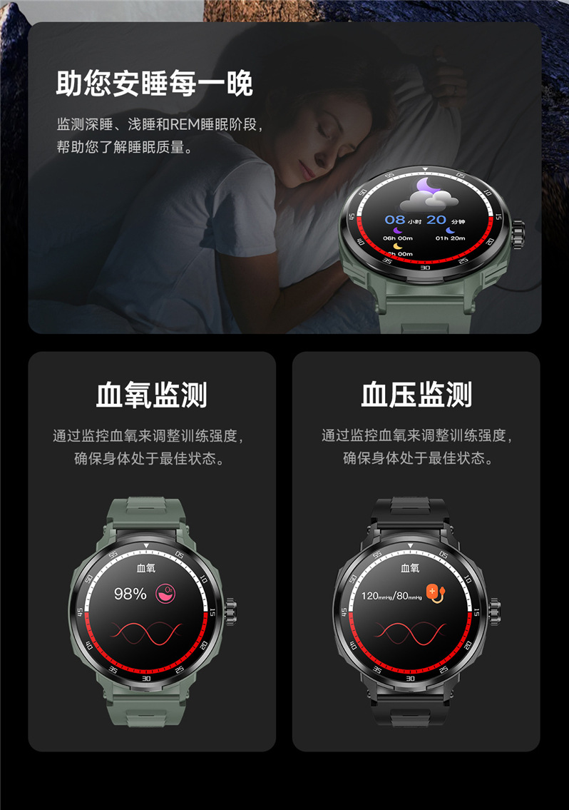 health monitoring (heart rate, blood oxygen, blood pressure, sleep) |