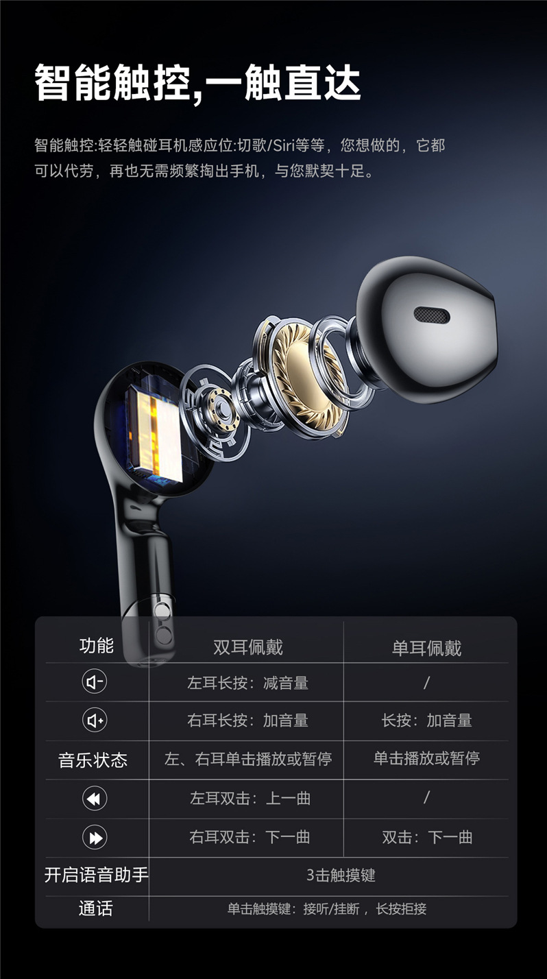 双耳佩戴,音乐状态:左、右耳单击播放或暂停/三击语音助手;左耳双击上一曲/长按减音量,右耳双击下一曲/长按加音量。单耳佩戴,音乐状态:双击下一曲,长按加音量,其他同双耳。通话:单击接听/挂断,长按拒接;通话过程中长按加音量。长按5秒开机,出仓自动配对,连接一次后出仓自动连接手机声音转耳机。出仓后过一定时间不连接蓝牙自动关机。 |