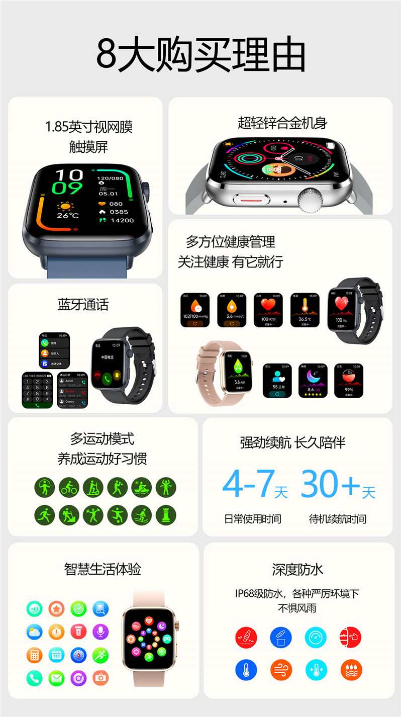 1.85-inch super retina 240*284 full touch screen, Bluetooth call, noninvasive blood sugar monitoring, HRV detection, body temperature monitoring, Meto function, SOS emergency call function, heart rate monitoring, red true blood oxygen monitoring, blood pressure monitoring, respiratory training, women's health (menstrual tracking), sleep monitoring, stress detection, sedentary reminder, NFC access control function, rotary encoder, etc. Step counting/calories/distance, multi-movement mode, alarm clock, weather forecast, intelligent voice assistant, game, flashlight, music playback and control, calculator, calendar, stopwatch. APP:Hband. |