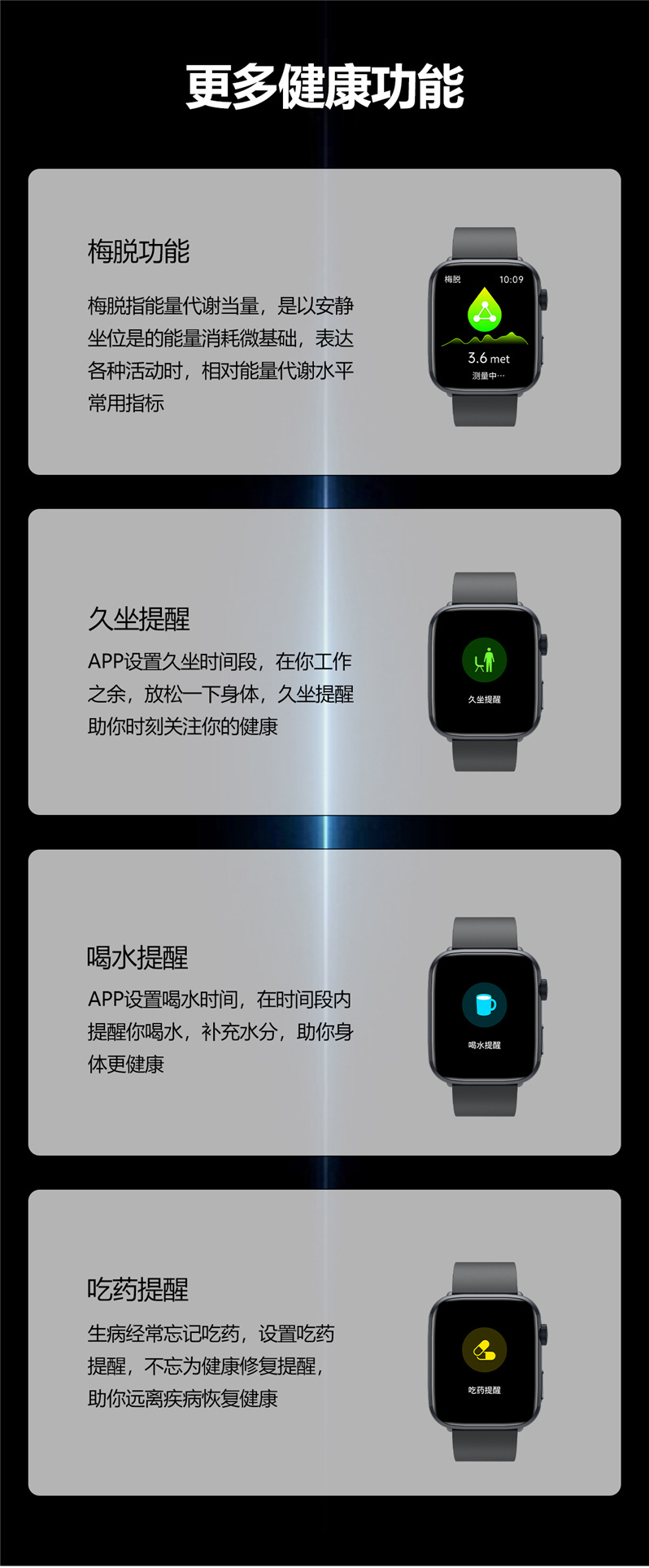 无创血糖测量,HRV检测,体温监测,梅脱功能,SOS紧急呼叫功能,心率监测,血氧监测,血压监测,呼吸训练、女性健康(经期跟踪),睡眠监测、压力检测,久坐提醒等健康功能。 |