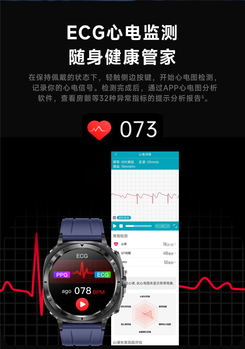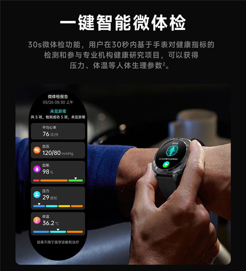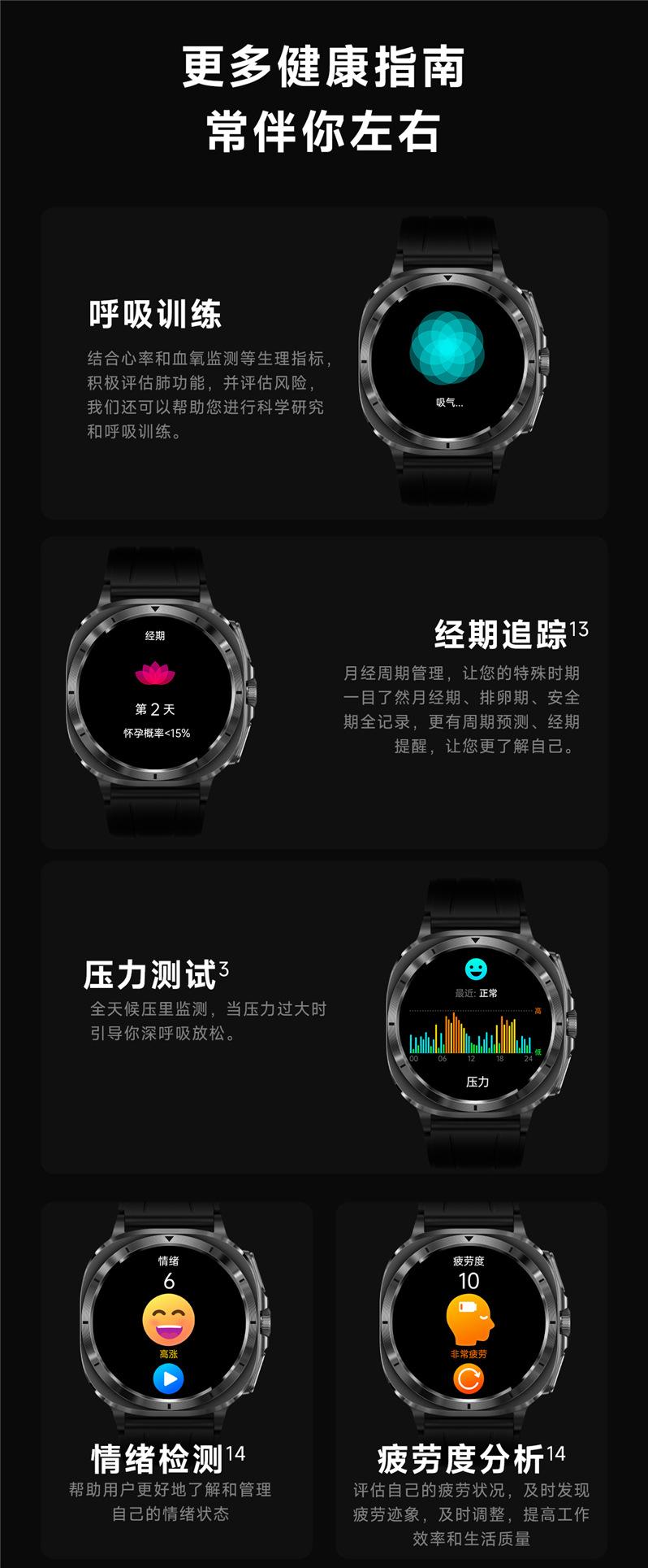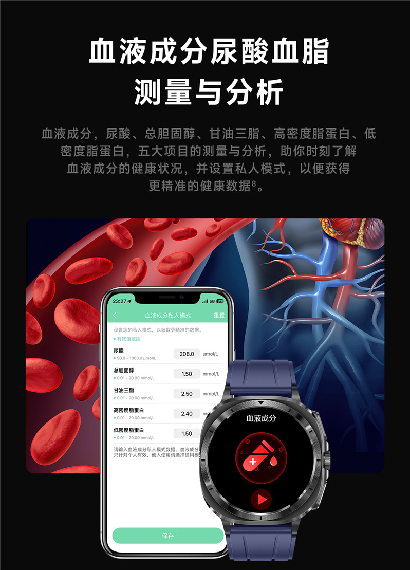 ECG心电图、微体检功能、情绪检测、疲劳度检测,HRV检测。无创血糖监测,血液成分测量(尿酸血脂功能),体脂BMI测量、梅脱功能,SOS紧急呼叫功能,血氧监测,血压监测,呼吸训练、女性健康(经期跟踪)、心率监测,24小时科学睡眠、久坐提醒等健康功能。 |