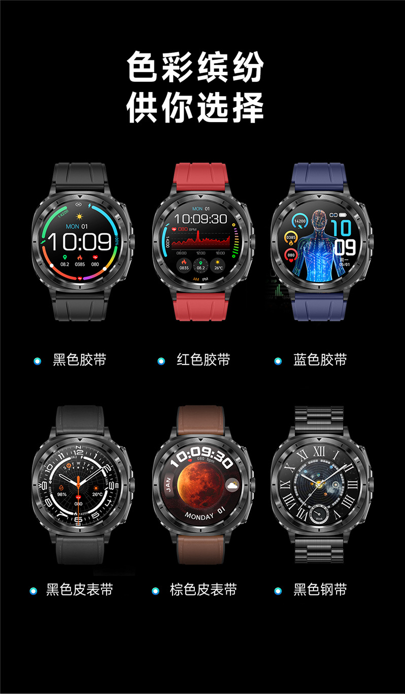 机身黑色: 硅胶表带黑、红、蓝; 皮表带黑色、棕色; 三株钢表带黑色。 |