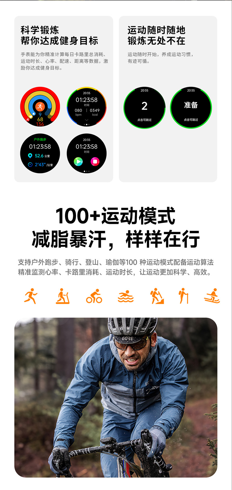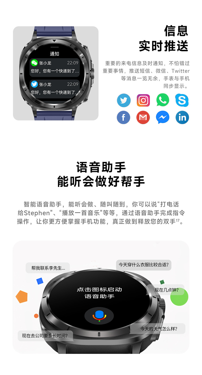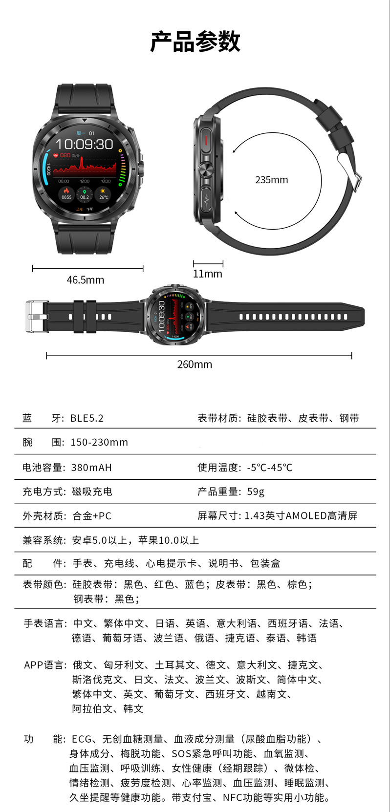 1.43英寸466*466 AMOLED全触摸屏,蓝牙通话,ECG心电图、微体检功能、HRV检测,情绪检测、疲劳度检测,无创血糖监测,血液成分测量(尿酸血脂功能),体脂BMI测量、梅脱功能,SOS紧急呼叫功能,血氧监测,血压监测,呼吸训练,女性健康(经期跟踪),支付宝、NFC门禁,心率监测,科学睡眠监测、久坐提醒等。 计步/卡路里/距离,多运动模式,闹钟,息屏显示功能,天气预报,智能语音助手,游戏,手电筒,音乐播放和控制。 APP:Hband. |