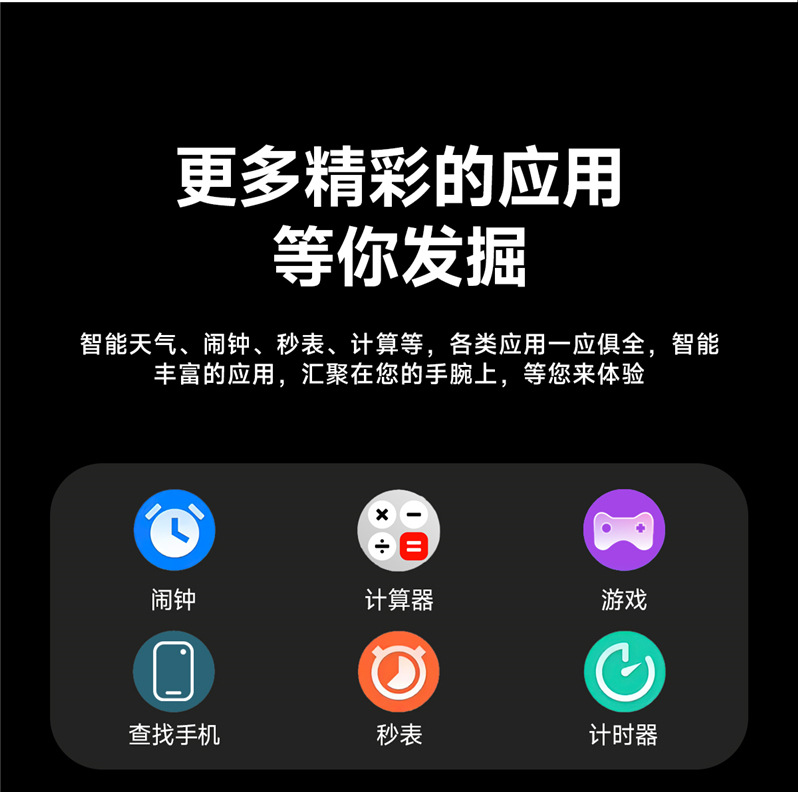 Alipay, stopwatch, flashlight, countdown, step counting, calories, distance, sleep monitoring, exercise mode, incoming call reminder, alarm clock reminder, raising hand to light up the screen, social sharing (WeChat, QQ, Facebook, Twitter), etc. Shake photo, music control, calculator, game. |