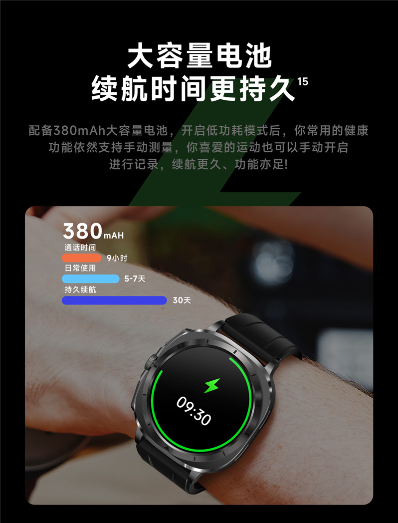 1.43 inch 466*466 AMOLED full touch screen, Bluetooth call, ECG, micro-physical examination function, HRV detection, emotion detection, fatigue detection, non-invasive blood sugar monitoring, blood component measurement (uric acid and lipid function), body fat BMI measurement, Metoff function, SOS emergency call function, blood oxygen monitoring, blood pressure monitoring, respiratory training, women's health (menstrual tracking), Alipay, etc. Step counting/calories/distance, multi-movement mode, alarm clock, information screen display function, weather forecast, intelligent voice assistant, games, flashlight, music playback and control. APP:Hband. |