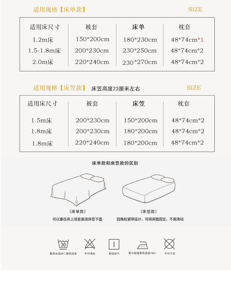 | Especificaciones de tamaño | Tres juegos de sábanas de 0,9 / 1,2 m [edredones 150 * 200 + sábanas 160 * 230 + fundas de almohada un 48 * 74cm], cuatro juegos de sábanas de 1,5 m [edredones 200 * 230 + sábanas 230 * 250 + fundas de almohada un par de 48 * 74cm], cuatro juegos de sábanas de 1,8 m [edredones 200 * 230 + sábanas 230 * 250 + fundas de almohada un par de 48 * 74cm], cuatro juegos de sábanas de 2,0 M [edredones 220 * 240 + 230 + sábanas 230 * 270 + fundas de almohada un par de 48 * 74cm], cuatro juegos de sábanas de 1,5 m [edredones 200 * 230 + 200 + fundas de edredones 150 * 200 * 200 funda de almohada un par de 48 * 74cm], funda de cama de 1,8 m cuatro piezas [funda de cama 200 * 230 + funda de cama 180 * 200 + funda de cama un par de 48 * 74cm], funda de cama de 1,8 m cuatro piezas para aumentar la funda de cama [funda de cama 220 * 240 + funda de cama 180 * 200 + funda de almohada un par de 48 * 74cm] |