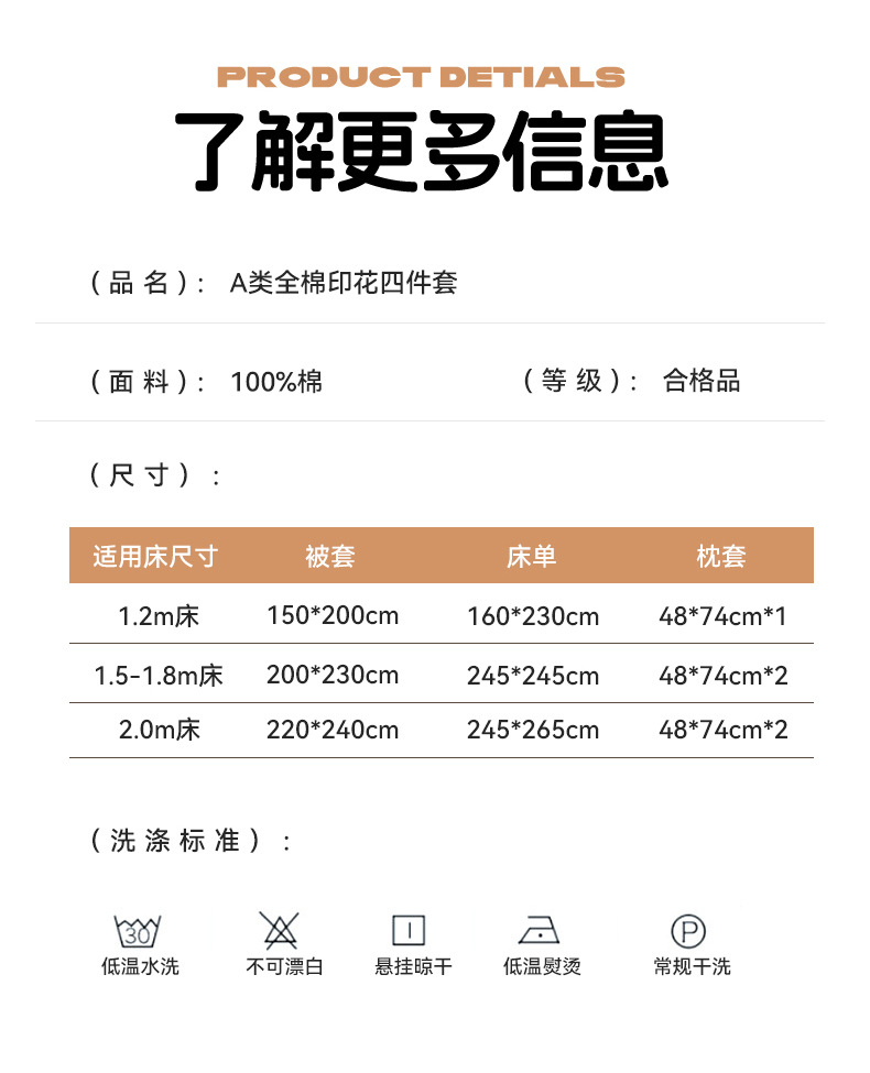 | Especificaciones de tamaño | 3 juegos de sábanas de 1,2 m (edredones 150 * 200 sábanas 160 * 230 fundas de almohada 48 * 74), 4 juegos de sábanas de 1,5 m (edredones 200 * 230 sábanas 245 * 245 fundas de almohada 48 * 74 * 2), 4 juegos de sábanas de 1,8 m (edredones 200 * 230 sábanas 245 * 245 fundas de almohada 48 * 74 * 2), 4 juegos de sábanas de 2,0 / 2,2 m (edredones 220 * 240 camas 245 * 265 fundas de almohada 48 * 74 * 2) |