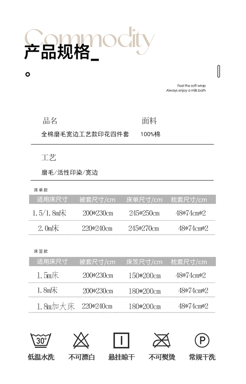 | Especificaciones de tamaño | Adecuado para cama de 1,5 m de cuatro piezas (200 * 230 sábanas 245 * 250 almohada 48 * 74 * 2), adecuado para la cama de 1,8 m cuatro piezas (200 * 230 sábanas 245 * 250 almohada 48 * 74 * 2), adecuado para la cama de 2 metros de cuatro partes (Copa de cama 220 * 240 sábanas 245 * 270 funda de almohada 48 * 74 * 2), 1.5 m cama de cuatro piezas (casa de cama 150 * 200 cubierta de edredón 200 * 230), 1.8 m cama de cuatro piezas (casa de cama 180 * 200 cubierta de edredón 200 * 230), más 1.8 m cama de cuatro piezas (casa de cama 180 * 200 cubierta de edredón 220 * 240) |