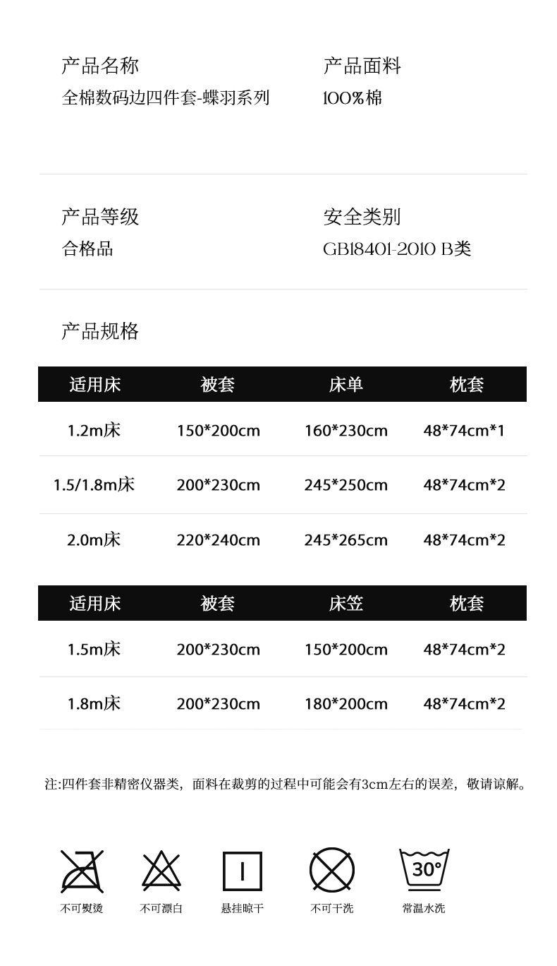 | Especificaciones de tamaño | Tres juegos de sábanas de 0,9 - 1,2 metros (edredones 150 * 200 sábanas 160 * 230 fundas de almohada 48 * 74 * 1), cuatro juegos de sábanas de 1,5 metros (edredones 200 * 230 sábanas 245 * 250 fundas de almohada 48 * 74 * 2), cuatro juegos de sábanas de 1,8 metros (edredones 200 * 230 sábanas 245 * 250 fundas de almohada 48 * 74 * 2), cuatro juegos de sábanas de 2,0 metros (edredones 220 * 240 sábanas 245 * 260 fundas de almohada 48 * 74 * 2), cuatro juegos de sábanas de 1,5 metros (edredones 200 * 230 fundas de cama 150 * 200 fundas de almohada 48 * 74 * 2), 1,8 juego de cuatro piezas de mi Li (juego de edredones 200 * 230 juego de edredones 180 * 200 funda de almohada 48 * 74 * 2) |