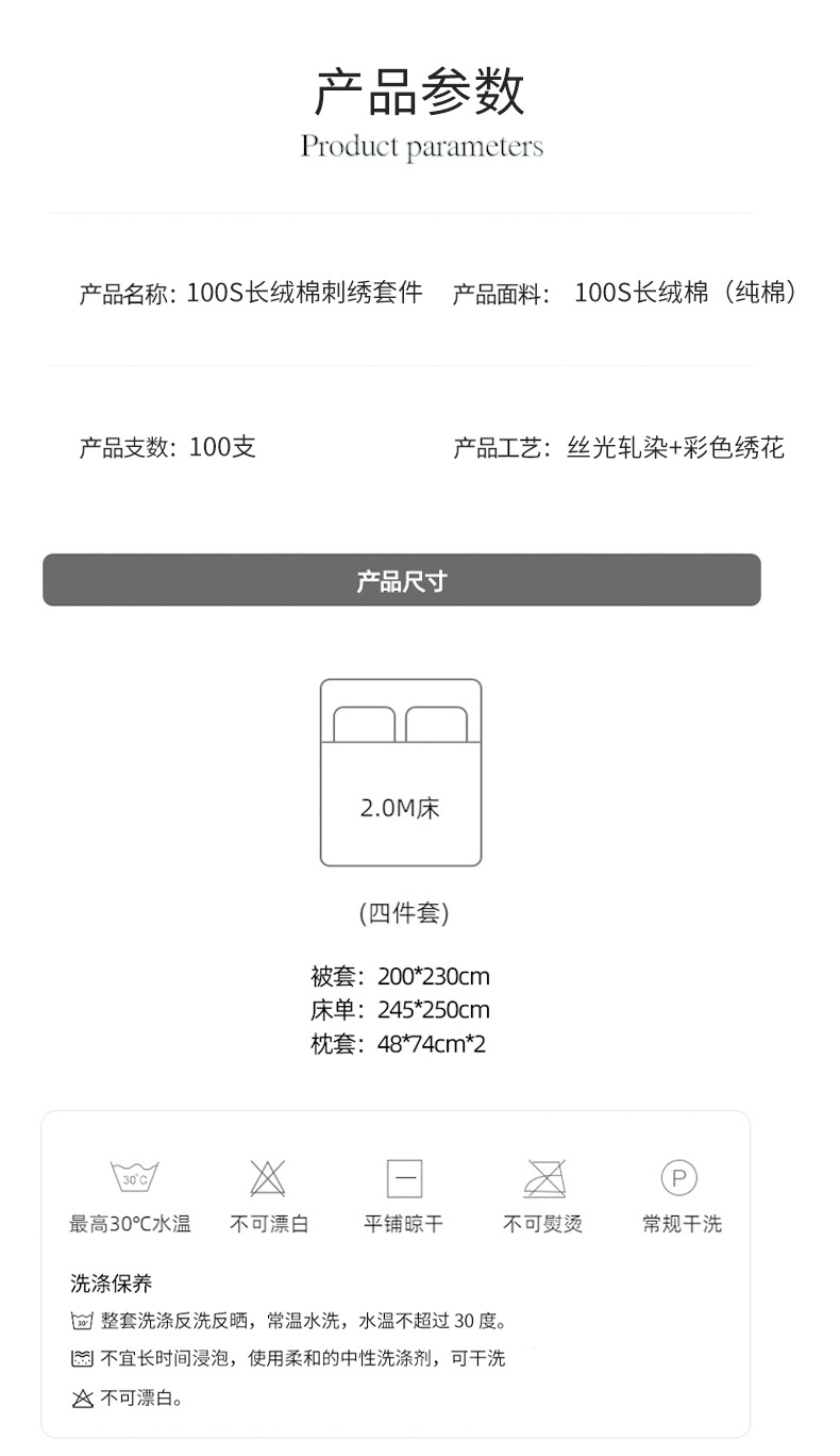 | Especificaciones de tamaño | Juegos de cuatro piezas para sábanas de 1,5 m (edredones 200 * 230 sábanas 235 * 250 fundas de almohada 48 * 74 * 2), juegos de cuatro piezas para sábanas de 1,8 m (edredones 200 * 230 sábanas 235 * 250 fundas de almohada 48 * 74 * 2) |