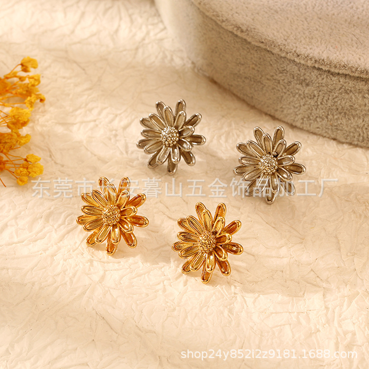 Pendientes de crisantemo de acero inoxidable transfronterizos europeos y americanos de alto grado de estilo de lujo ligero pendientes de mujer de todo fósforo 18K Pendientes chapados en oro