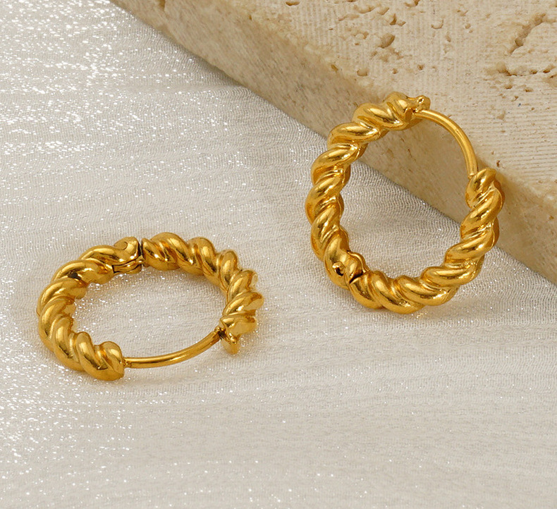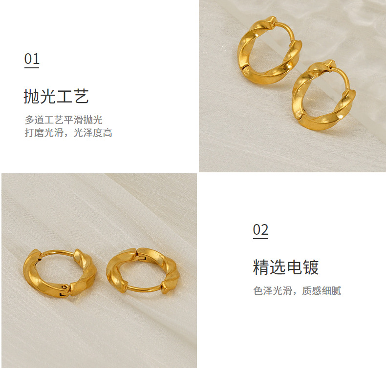 Pendientes chapados en oro de acero inoxidable de nueva moda europea y americana, sentido de diseño minimalista, todo fósforo, exquisito anillo de oreja pequeña de giro de acero de titanio para mujer