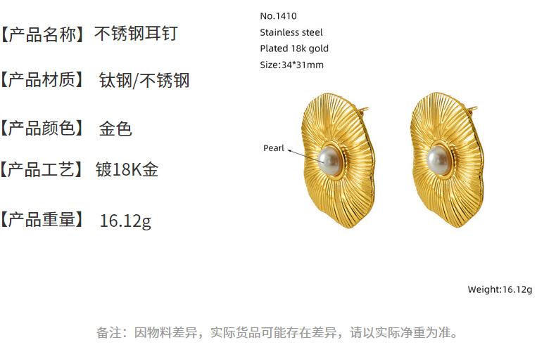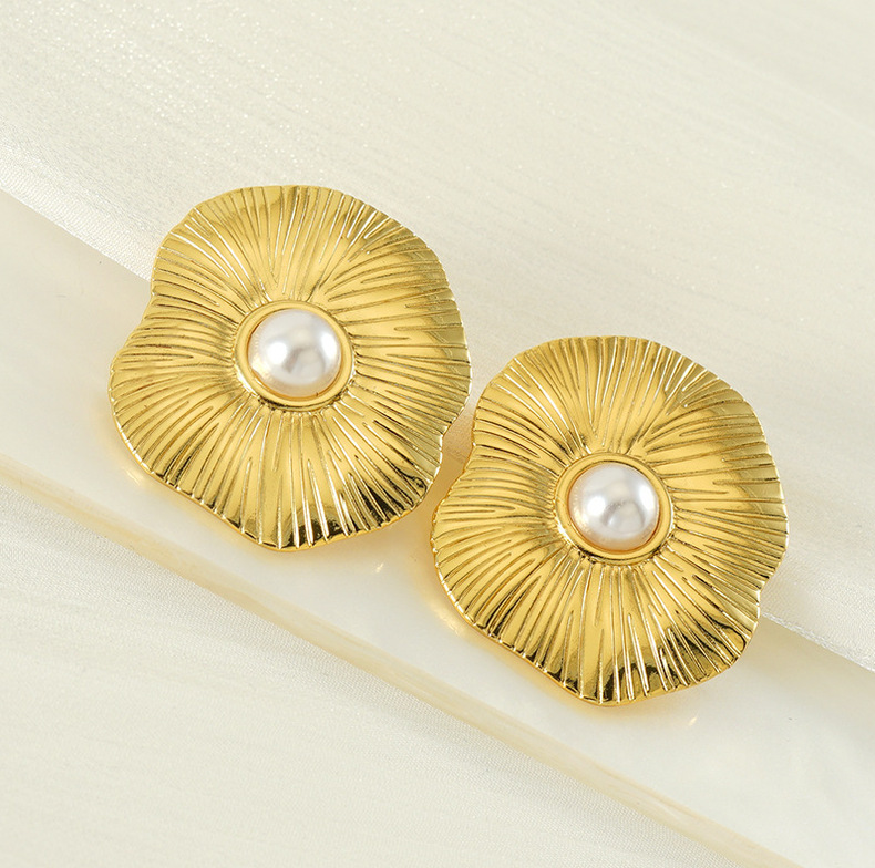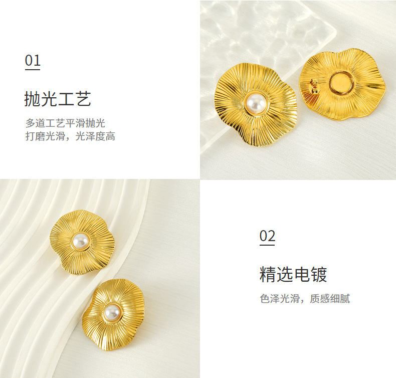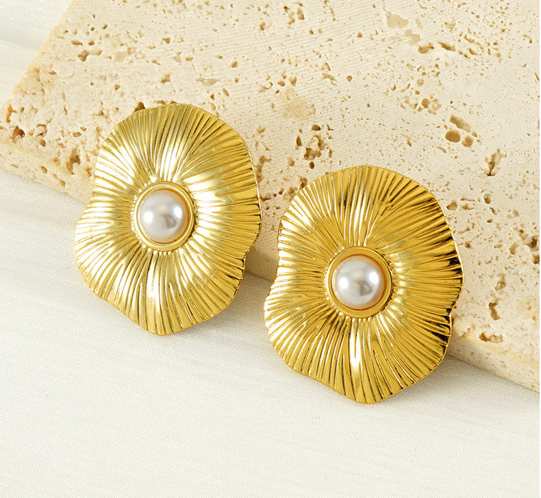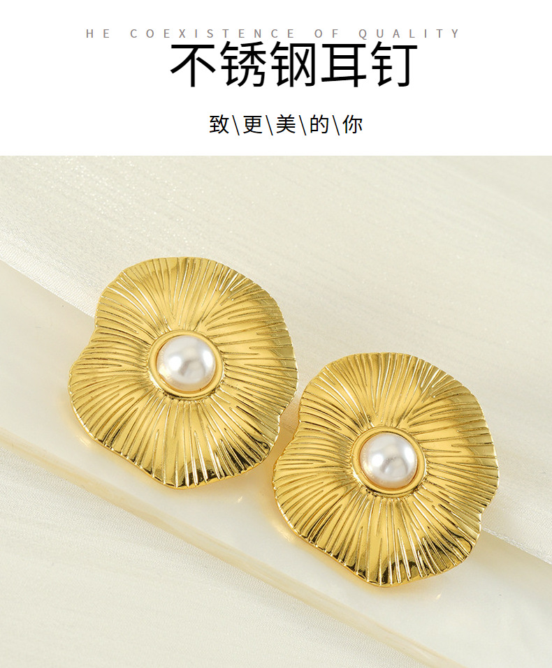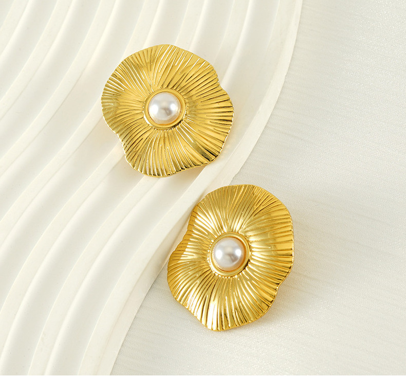 Pendientes de acero de titanio de estilo retro Pendientes de forma de pétalo chapado en oro de 18k Pendientes de perlas con incrustaciones de acero inoxidable de alta calidad para mujer