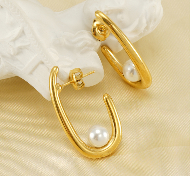 Transfronterizo europeo y americano de acero inoxidable en forma de U pendientes de perlas hembra 18K moda de alto grado de acero de titanio pendientes de la oreja anillo al por mayor