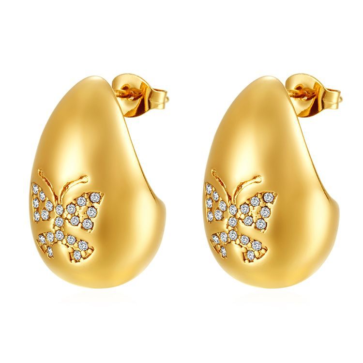La tendencia de moda europea y americana atmosférica de acero inoxidable gota de agua mosaico de mariposa estriado pendientes de zircón para mujeres chapado 18K pendientes