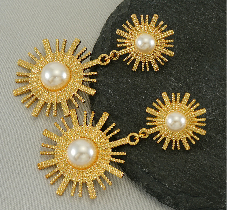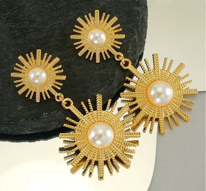 Moda europea y americana retro ronda girasol perla pendientes personalidad todo partido moda perla titanio acero chapado en oro pendientes para las mujeres