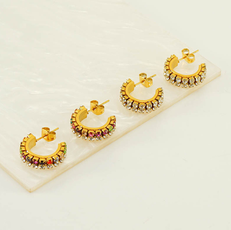 Pendientes de diamantes en forma de C únicos de temperamento transfronterizo estilo europeo y americano femenino 18K pendientes de acero inoxidable pendientes de diamantes coloridos al por mayor