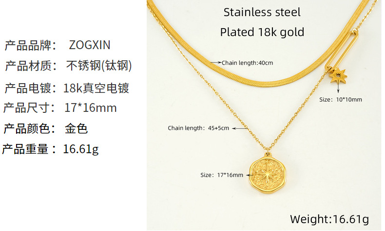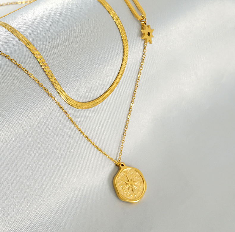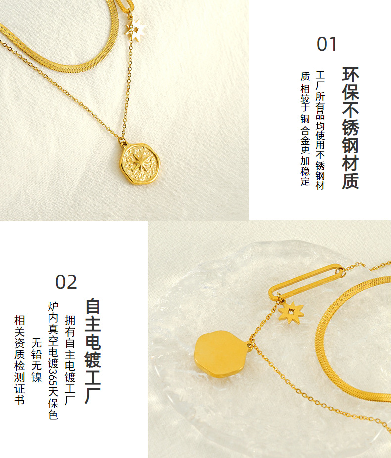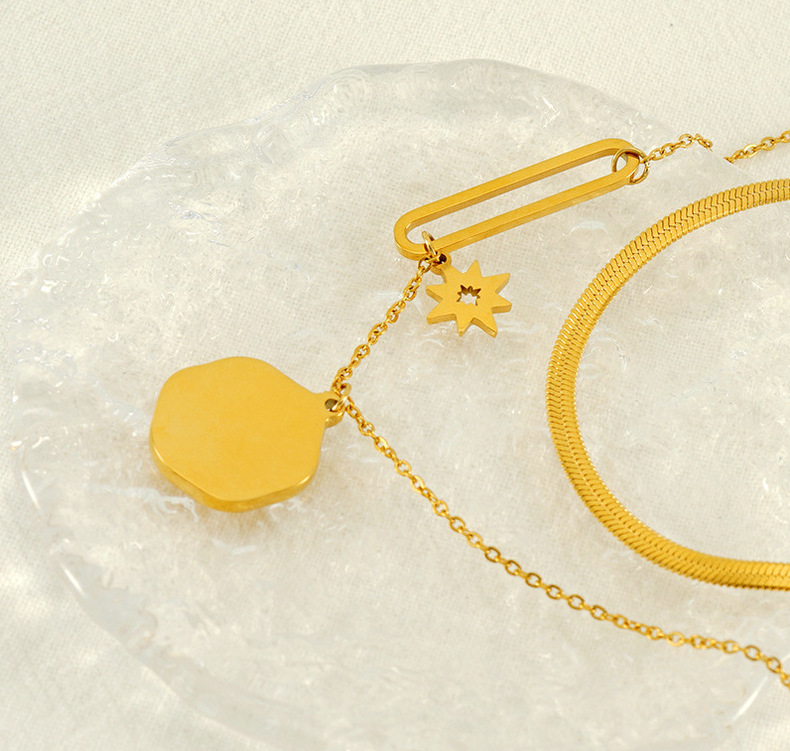 Collar de estrella de seis puntas con cadena de doble capa retro francesa nueva transfronteriza 2024 para mujer, joyería de acero inoxidable en stock, fabricante mayorista