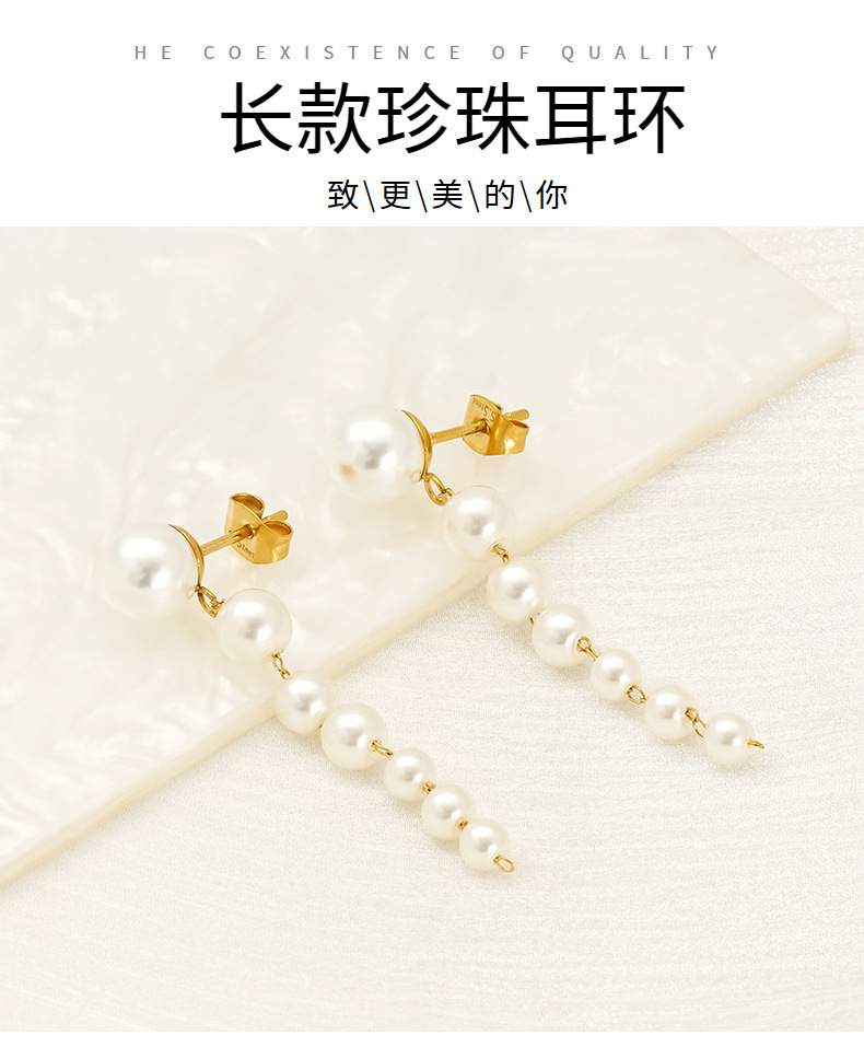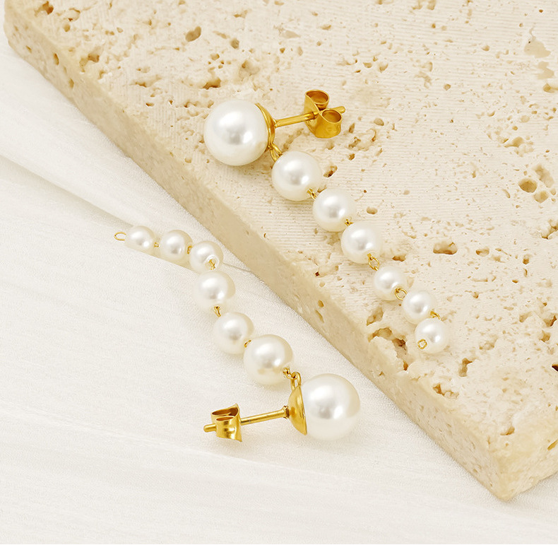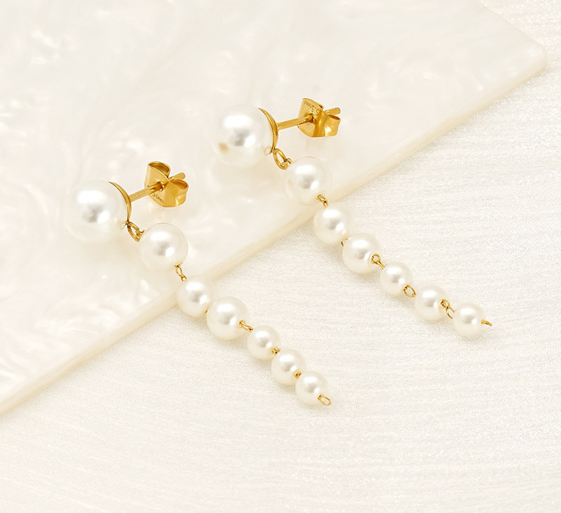 Pendientes largos de todo fósforo degradados de tamaño simple europeo y americano pendientes de borla de perlas pendientes de acero inoxidable de 18 quilates mujeres