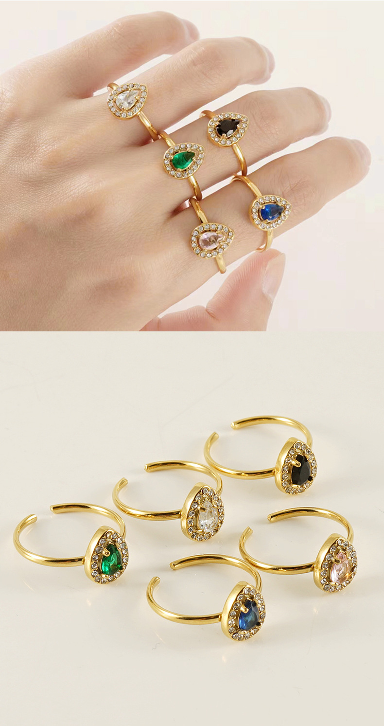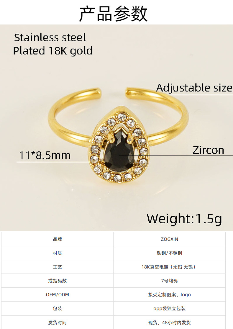 Moda europea y americana de acero inoxidable estilo ins anillo abierto hembra 18K oro luz lujo estilo gota de agua ZIRCON anillo ajustable