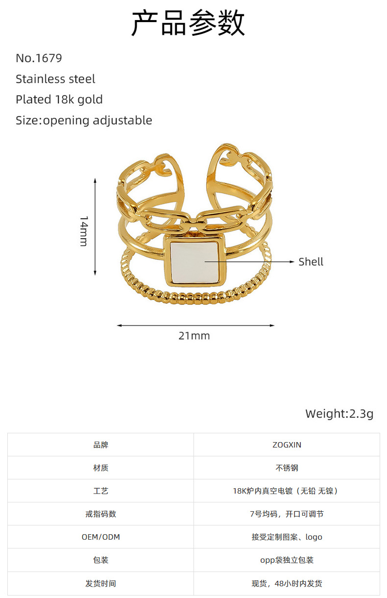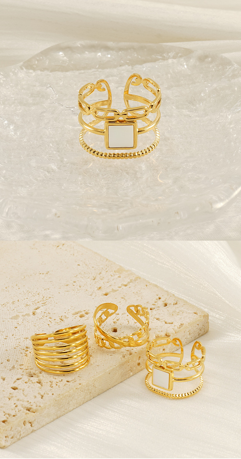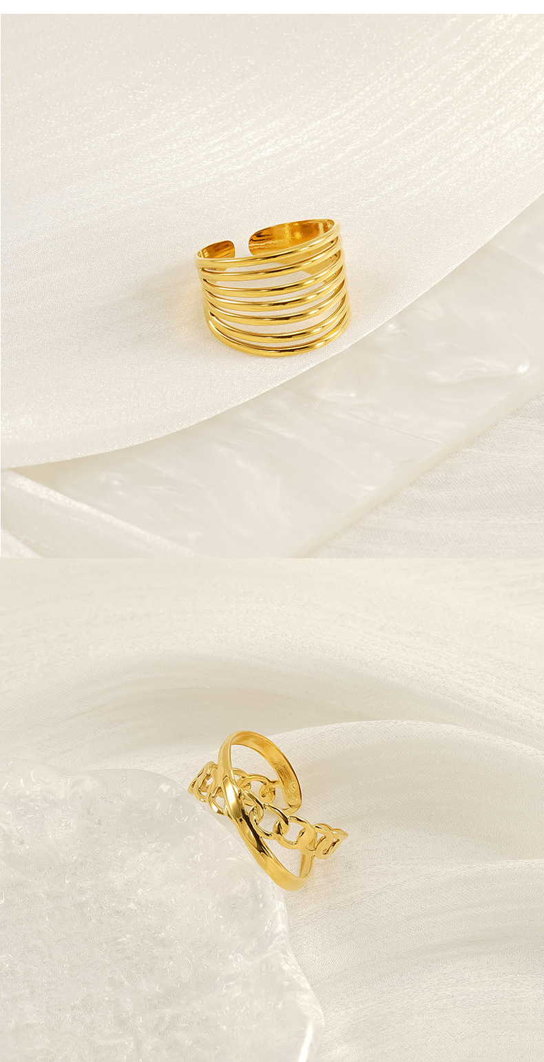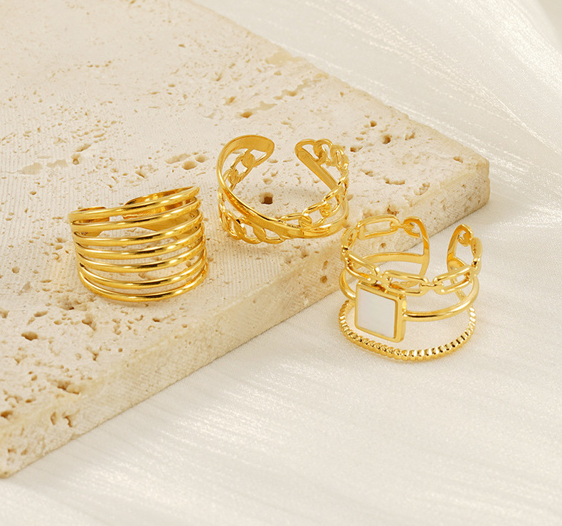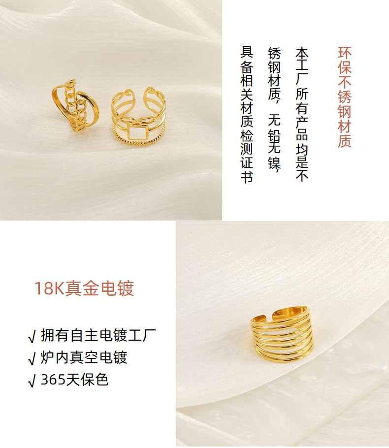 Nuevo anillo abierto geométrico hueco de lujo ligero europeo y americano transfronterizo, femenino, anillo de acero de titanio dorado de 18k, femenino