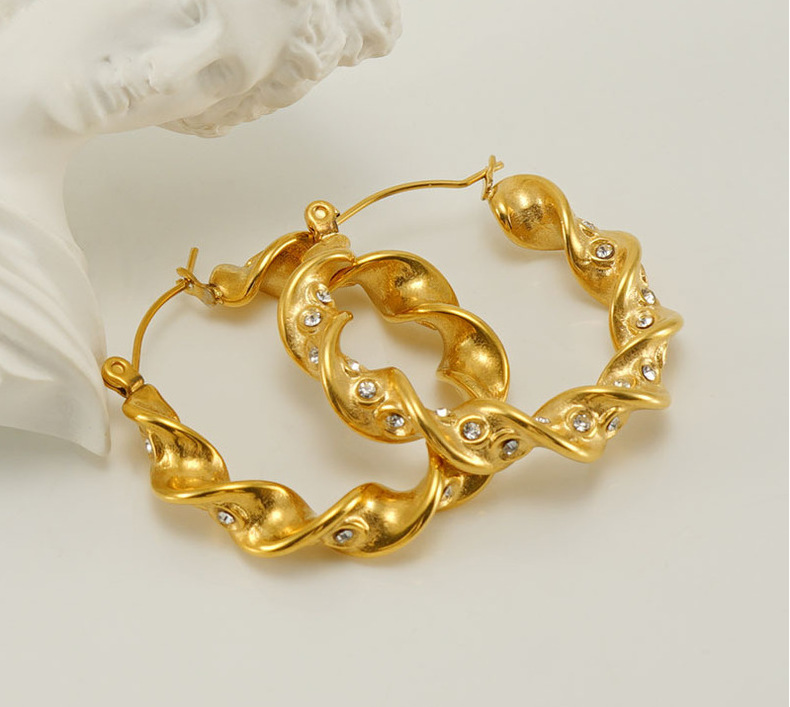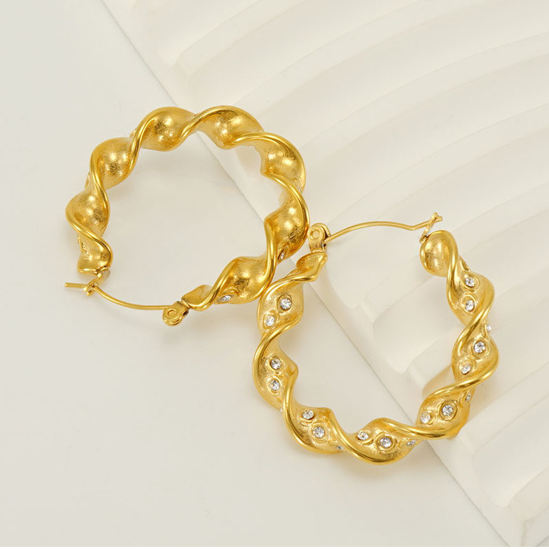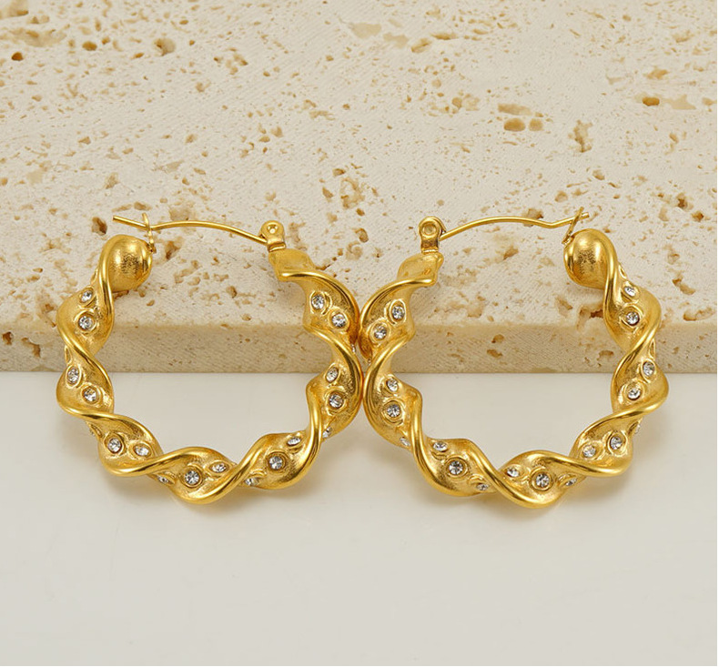 Europeo y americano de acero inoxidable torcido giro pendientes mujer moda temperamento Internet celebridad diamante-incrustado ronda de acero de titanio pendientes al por mayor