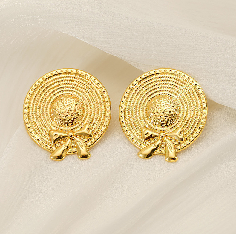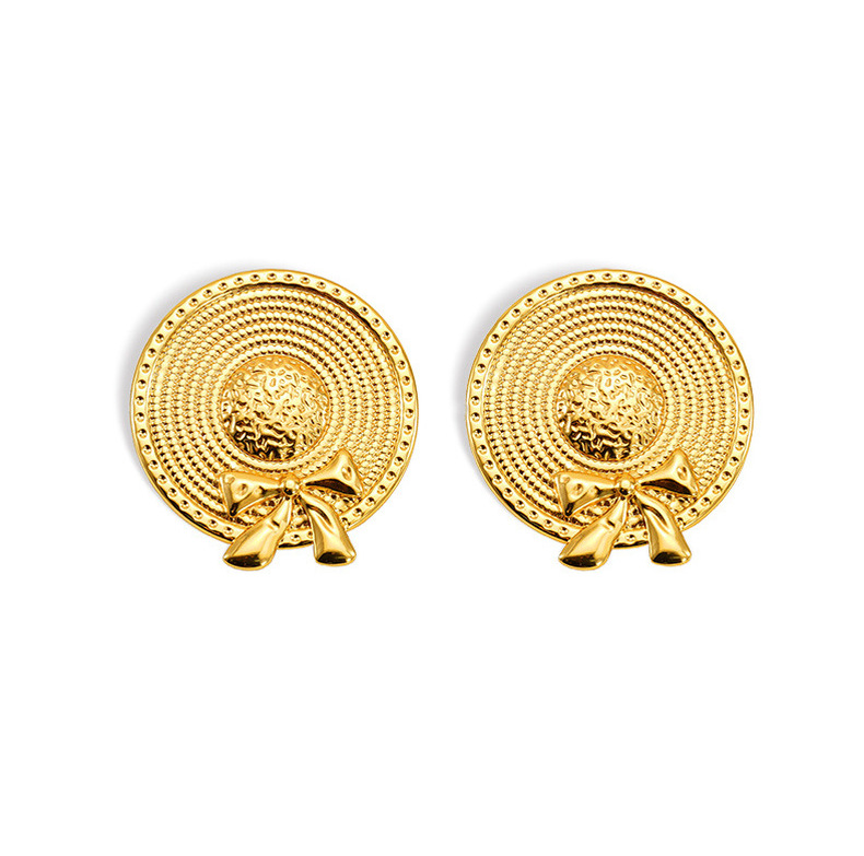 Pendientes de sombrero de paja con lazo de acero inoxidable nuevo transfronterizo europeo y americano Pendientes de acero de titanio dorado de moda de estilo INS femenino