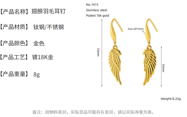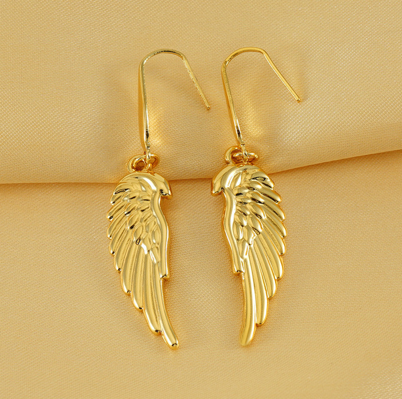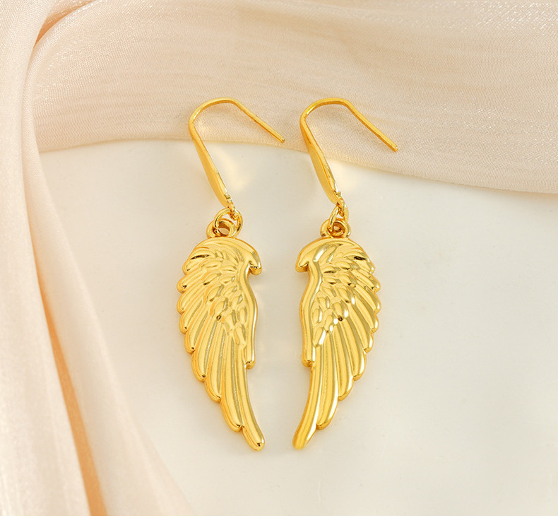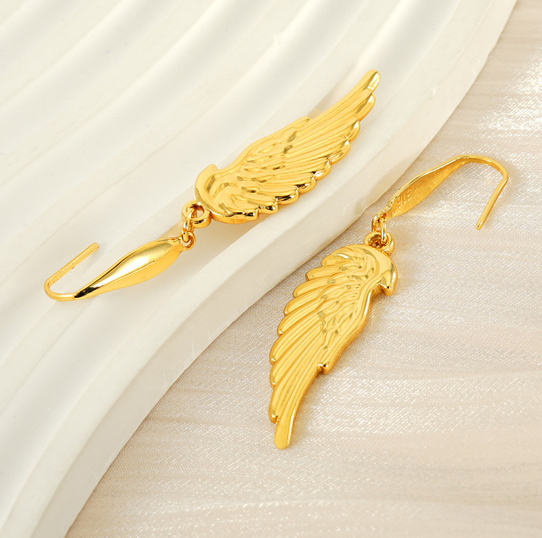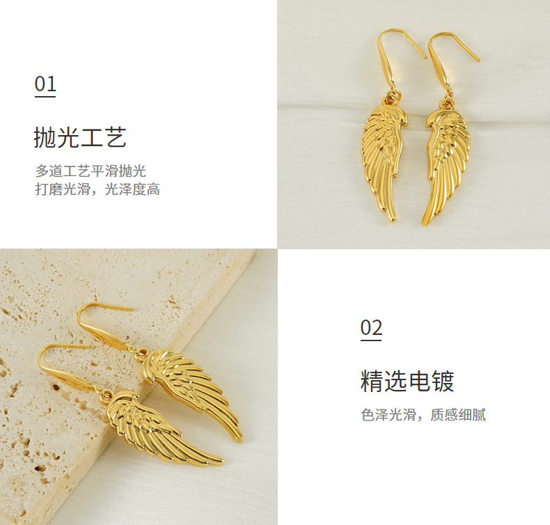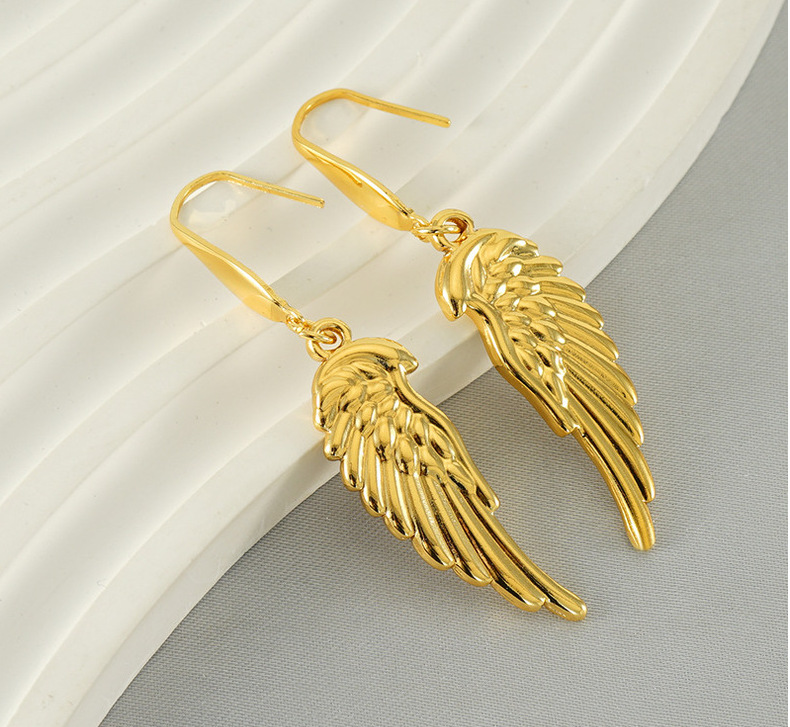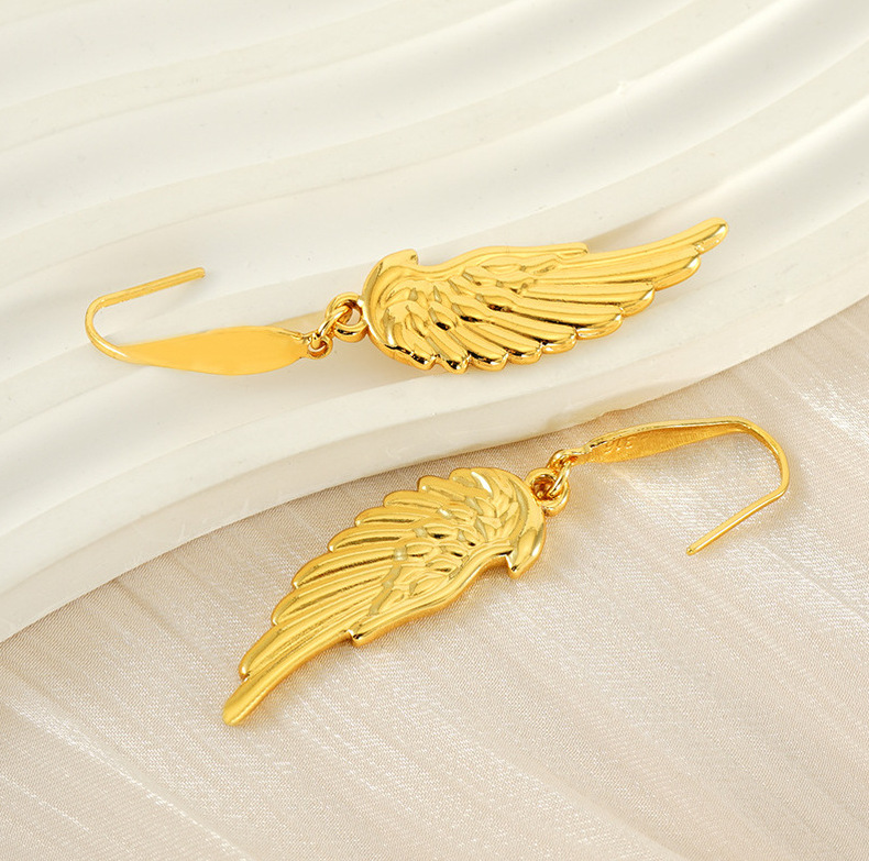 Nuevo diseño transfronterizo, pendientes de alas de plumas de acero inoxidable, pendientes de moda chapados en oro únicos, fábrica al por mayor