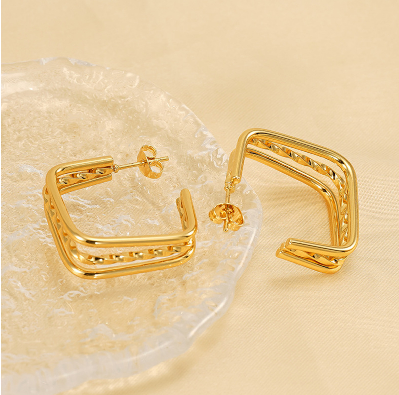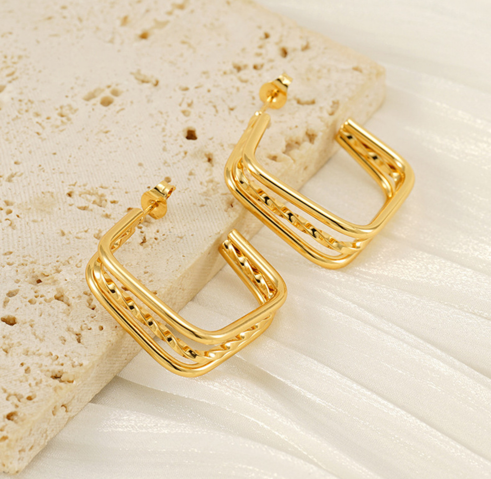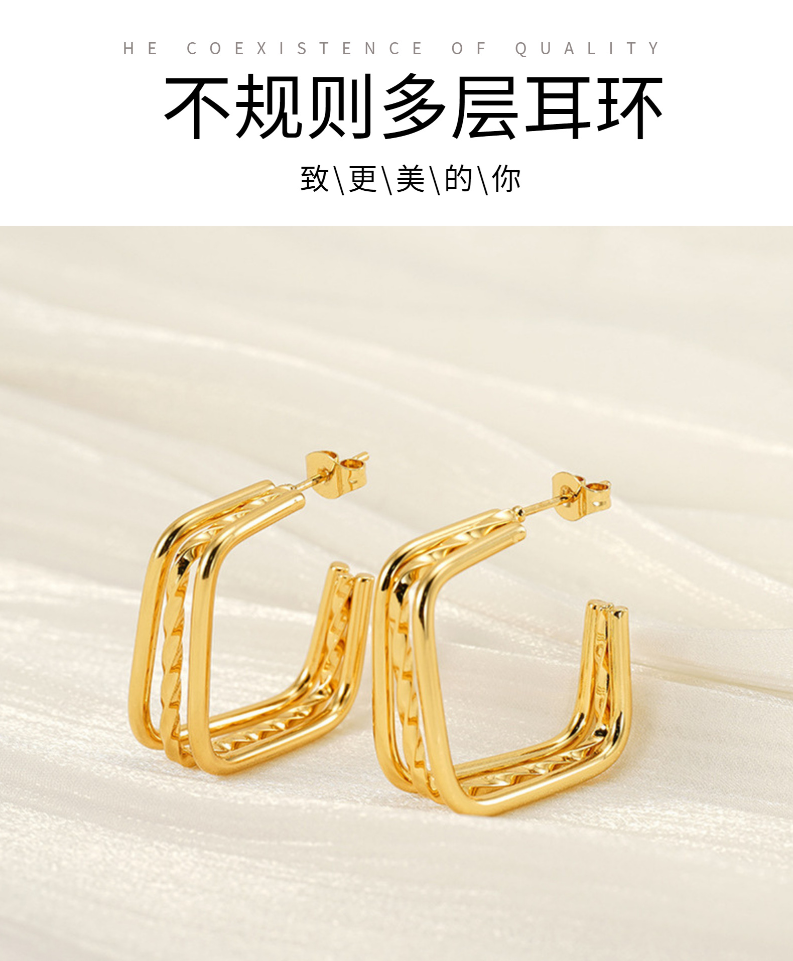 Pendientes de acero inoxidable multicapa europeos y americanos transfronterizos Pendientes de acero de titanio cuadrado geométrico chapado en oro de temperamento simple femenino