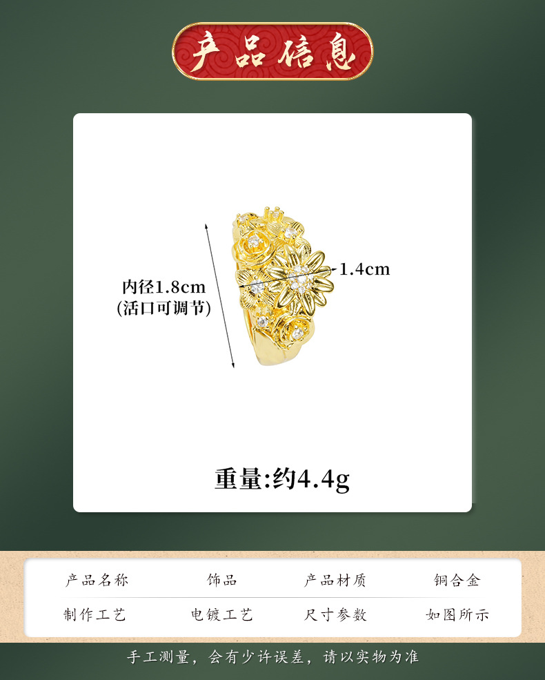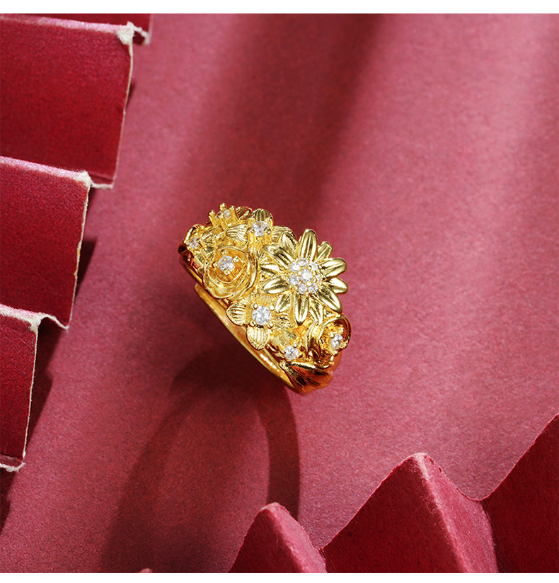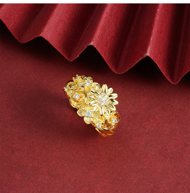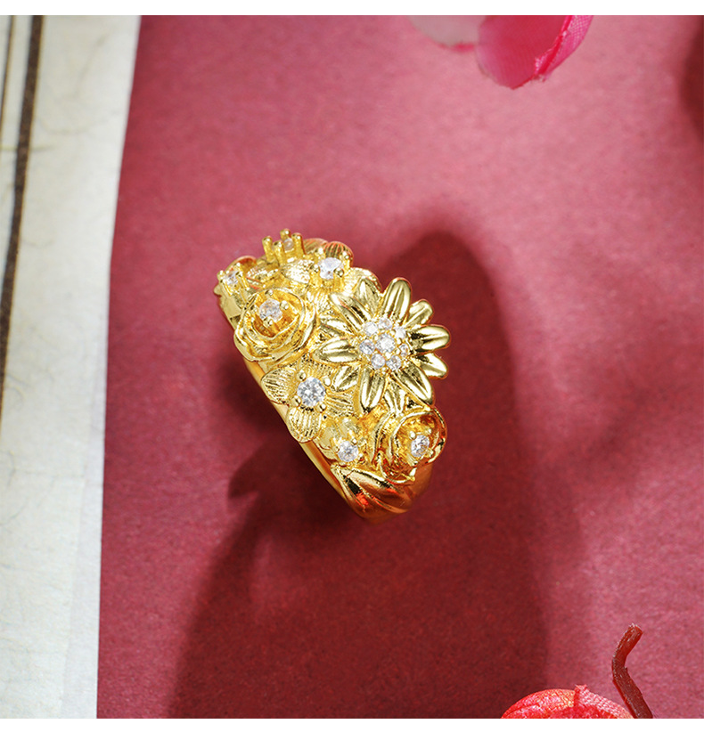 Anillo de oro de arena vietnamita retro floreciente brocado anillo de flores de bronce de lujo ligero dorado no se desvanece joyas